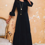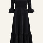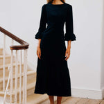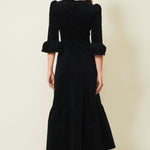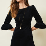 The round neckline and fitted bodice balance perfectly with softly flared lines. Finished with 3/4 puff sleeves trimmed with a double ruffle and a concealed back zip, this fit and flare cord dress brings vintage-inspired elegance.