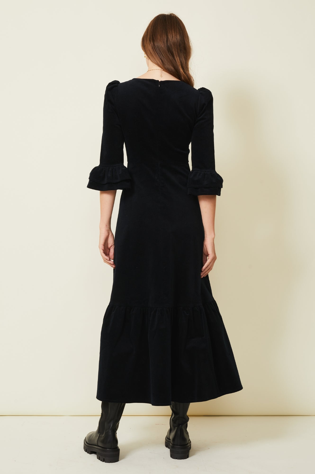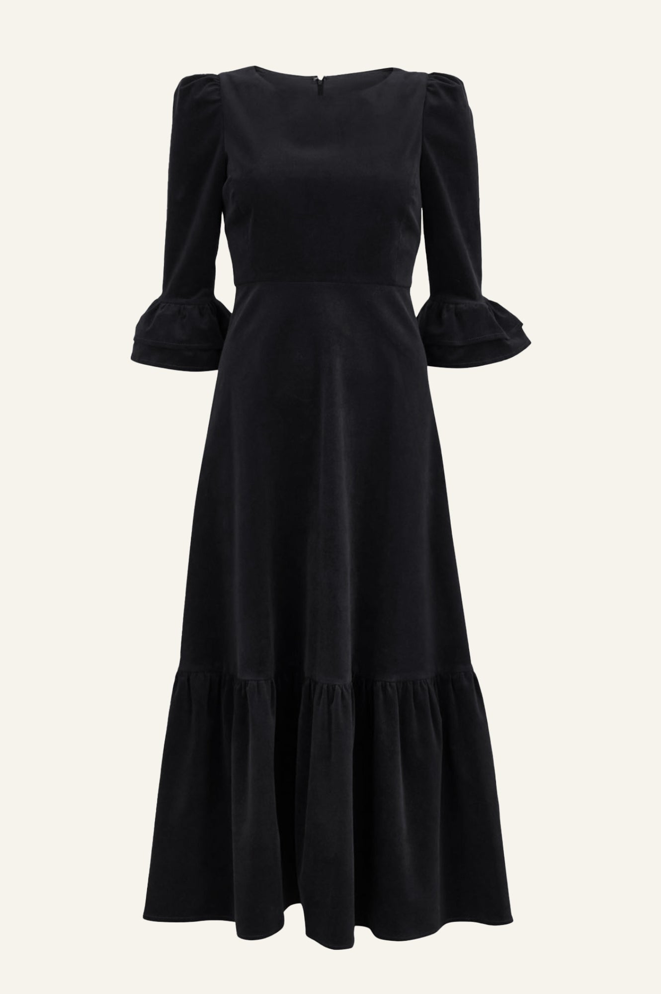 The Victoria Round Neck Corduroy Midi Dress in Black by Aspiga is a timeless piece crafted from organic cotton stretch corduroy. A black corduroy midi dress that blends classic tailoring with sustainable fabric for everyday elegance.