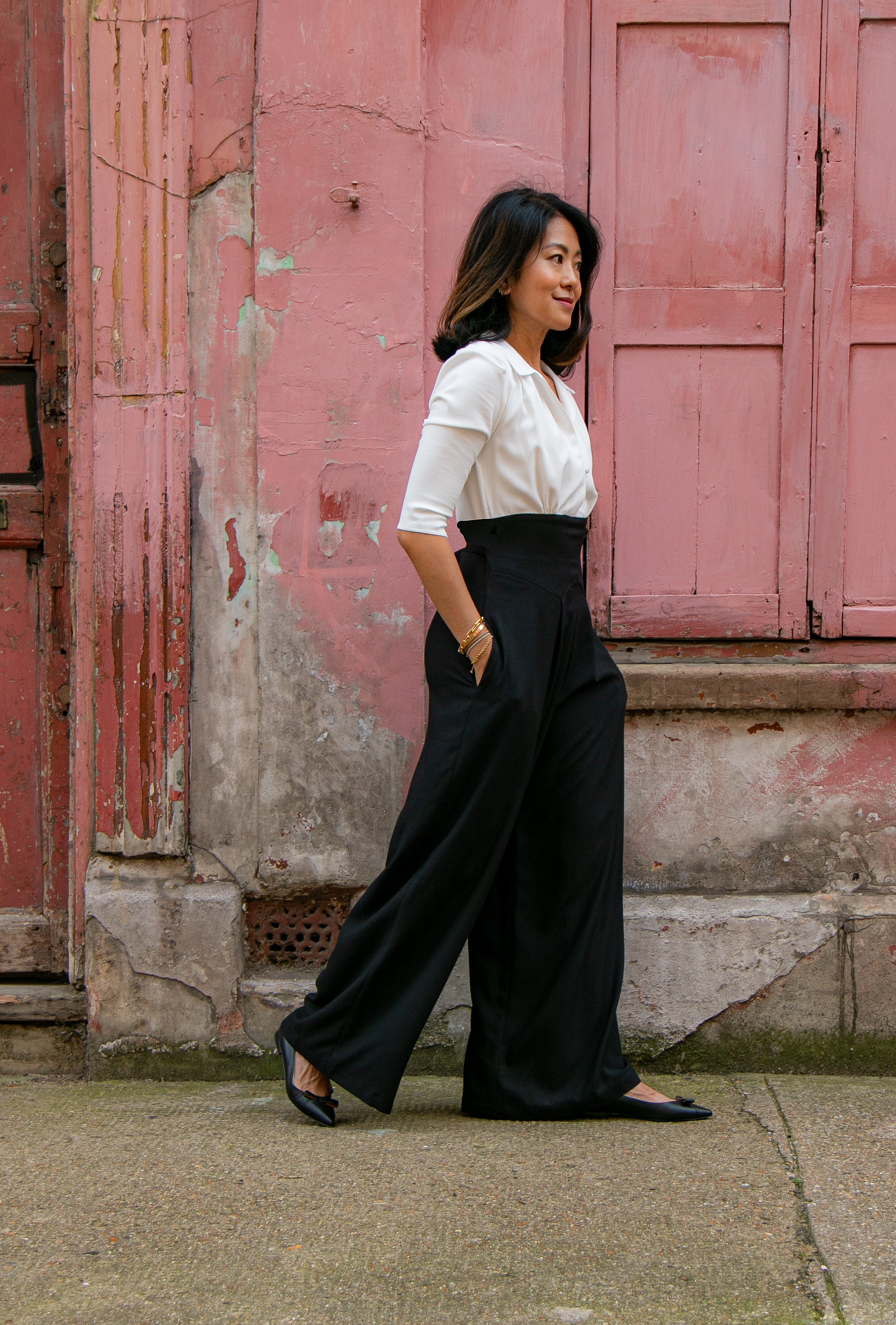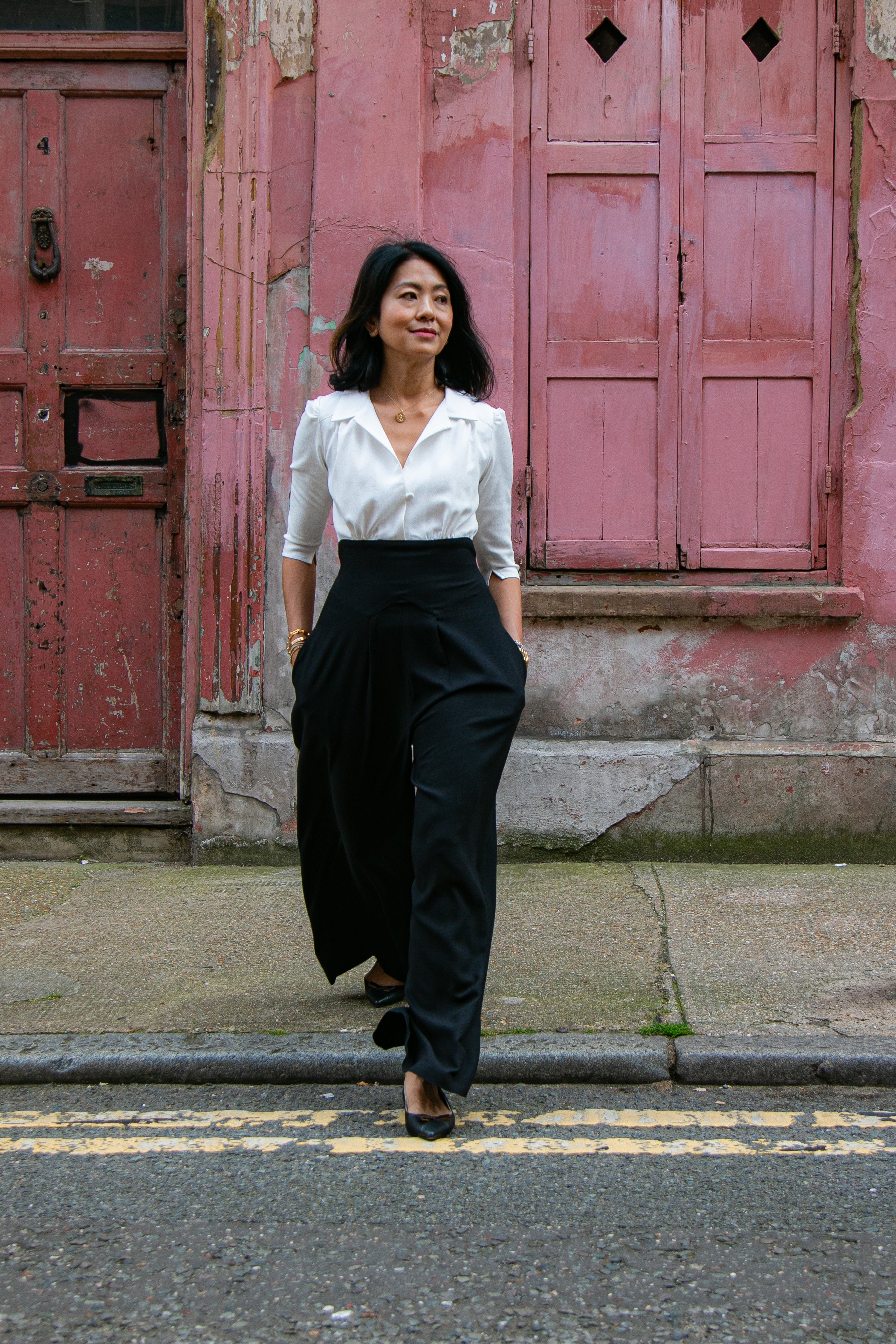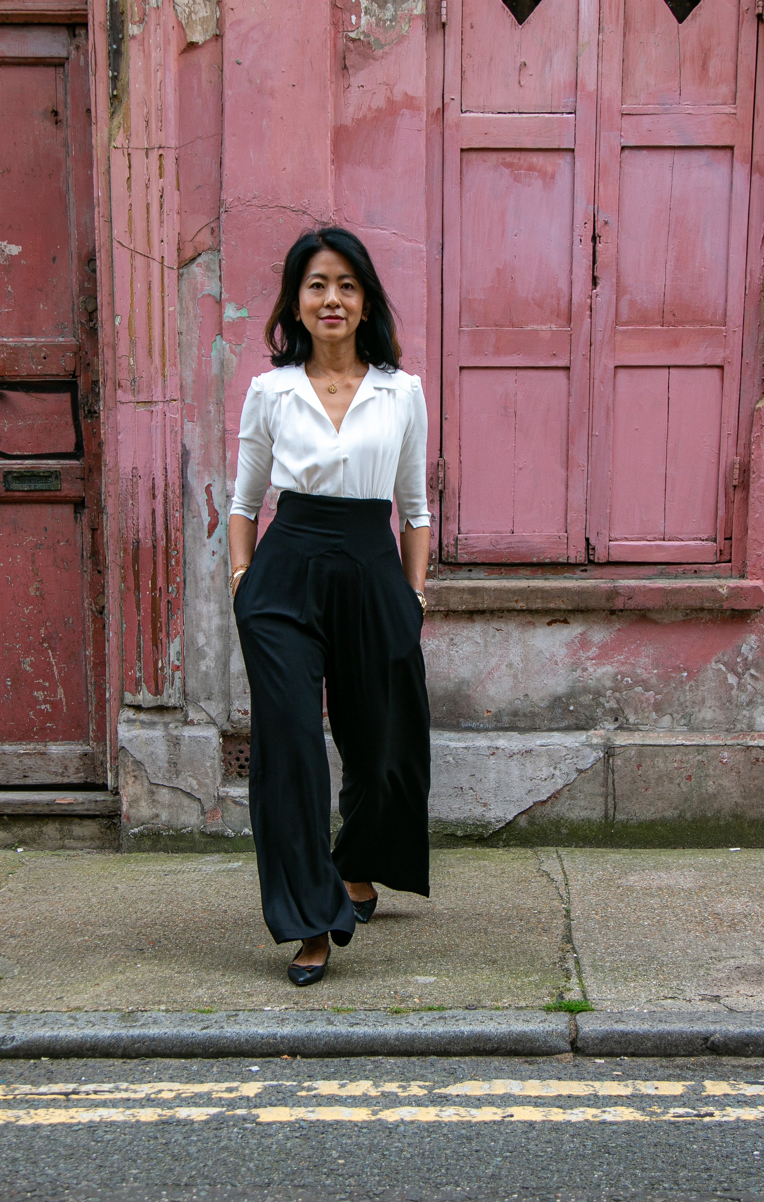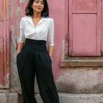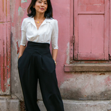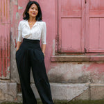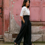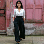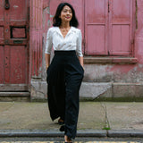 The tailored jumpsuit by Elaine Bernstein is her best selling style for a reason; the unrivalled mix of flattering and comfortable. The ivory shirt and black crepe trouser jumpsuit is made in a poly/viscose mix, the flow of the fabric means it hangs brilliantly.  With 2% elastane the fabric  expands and contracts accordingly making it a wear everywhere investment piece.