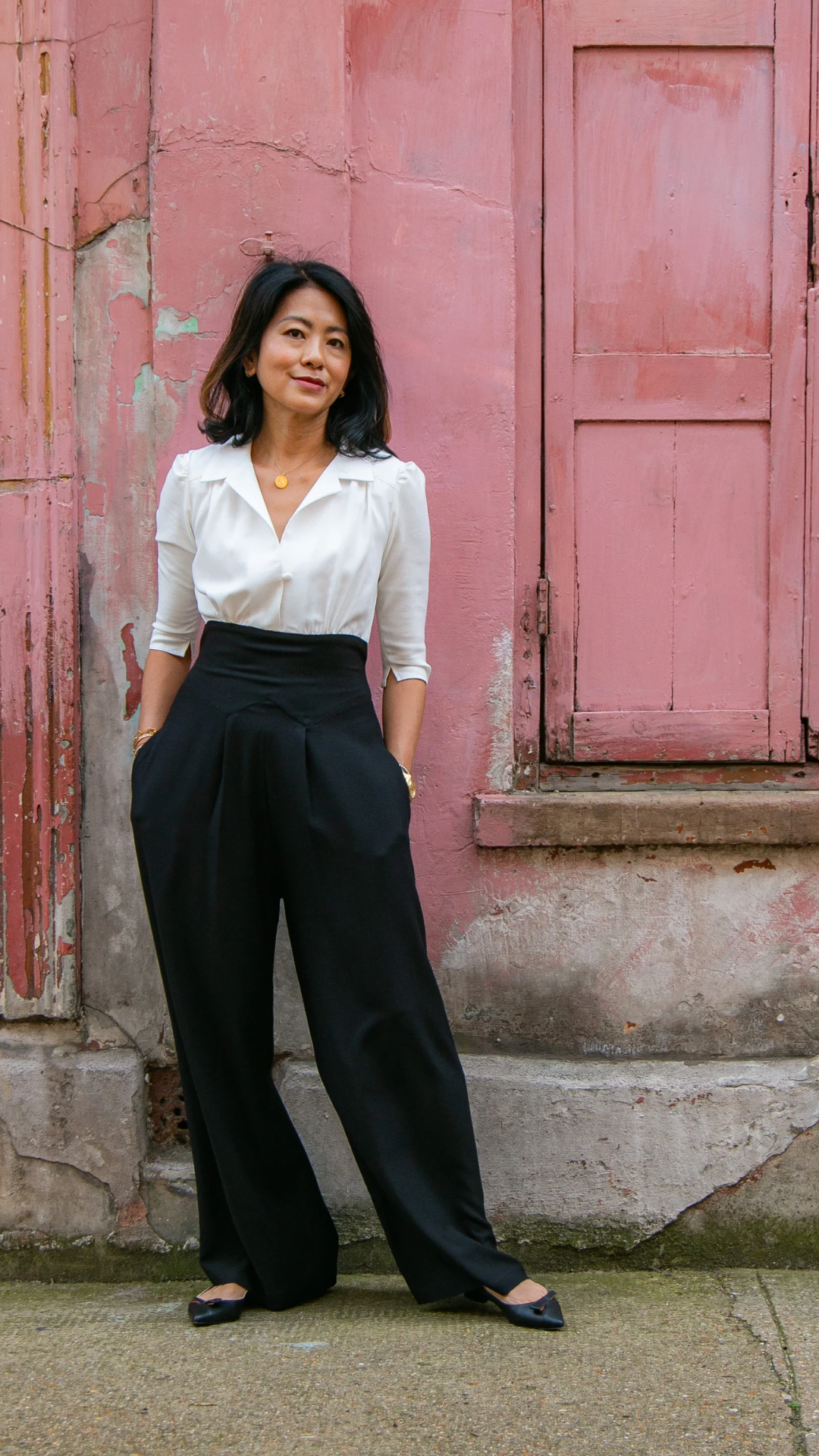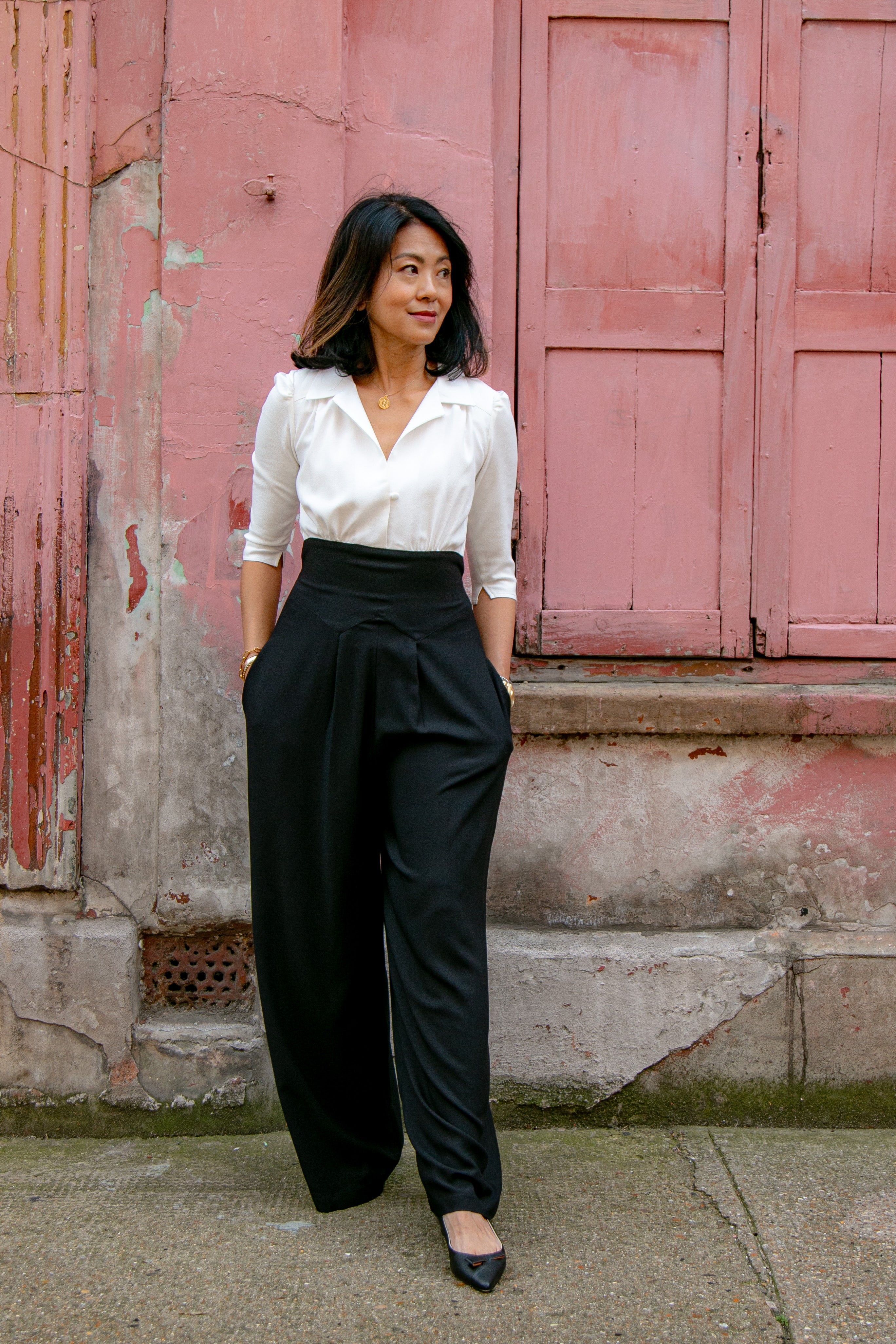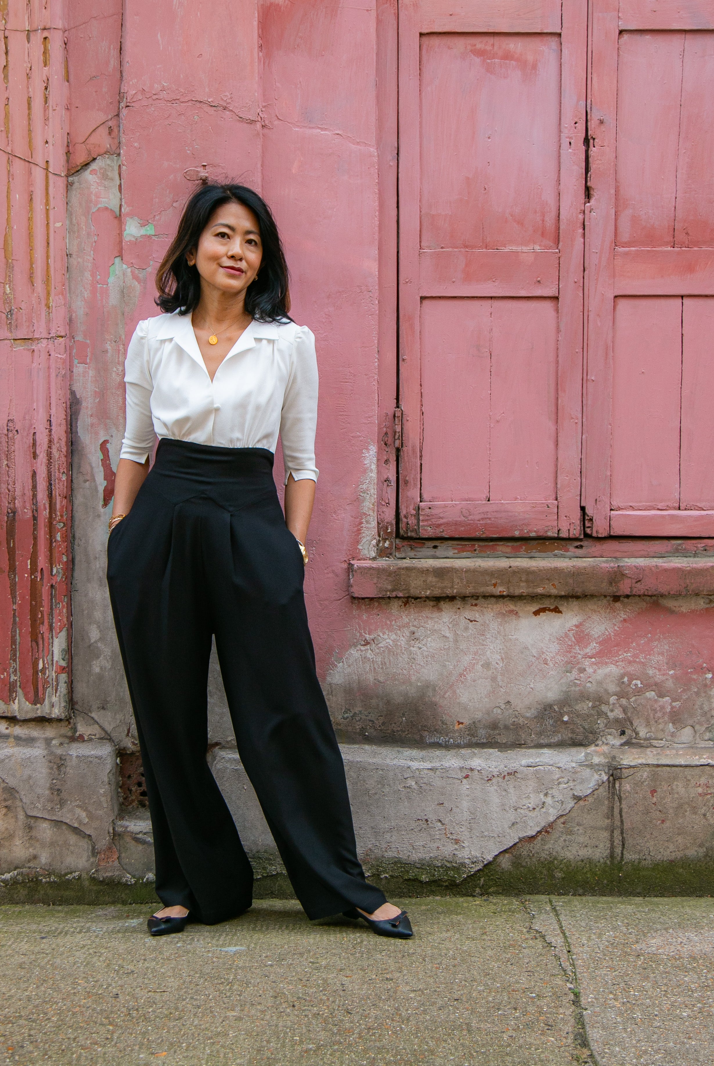 The tailored jumpsuit by Elaine Bernstein is her best selling style for a reason; the unrivalled mix of flattering and comfortable. The ivory shirt and black crepe trouser jumpsuit is made in a poly/viscose mix, the flow of the fabric means it hangs brilliantly.  With 2% elastane the fabric  expands and contracts accordingly making it a wear everywhere investment piece.