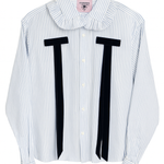 The Blue Stripe Velvet Bow Shirt from Grandpa's Shirts reimagines a classic men's shirt into a feminine, statement piece. With its boxy fit and crisp blue stripe, it offers timeless style elevated by playful detailing.