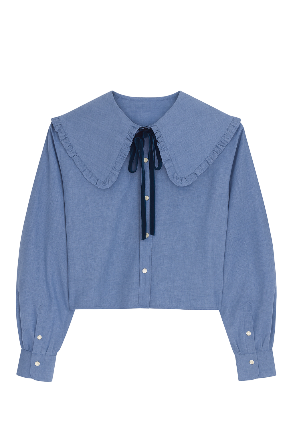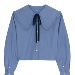 The exaggerated frill collar and navy bow ties at the neck and cuffs create a standout look that feels both feminine and fashion-forward.