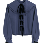 The Navy Tie Neck Shirt with Big Frill Collar from Grandpa's Shirts is a standout reimagined piece. Crafted from an upcycled men's shirt, it features a dramatic oversized frill collar and black velvet tie-front fastening for a striking finish.