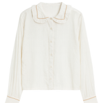 Ivory Shirt with Mini Frill Collar and Gold Trim, from Grandpa’s Shirts. A boxy-fit shirt crafted from an upcycled men’s shirt, reimagined with a delicate frill collar for a unique, tailored look.