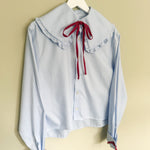 The Pale Blue Tie Neck Shirt with Big Frill Collar is a striking upcycled design from Grandpa's Shirts. Crafted from an upcycled men's shirt, it has been reimagined with an oversized frill collar and bold red bow details for a playful yet timeless finish.
