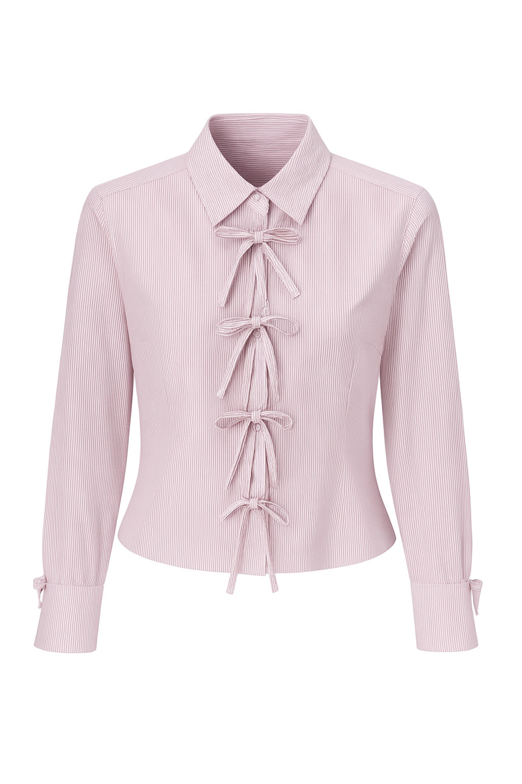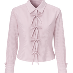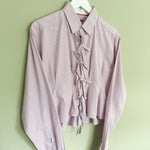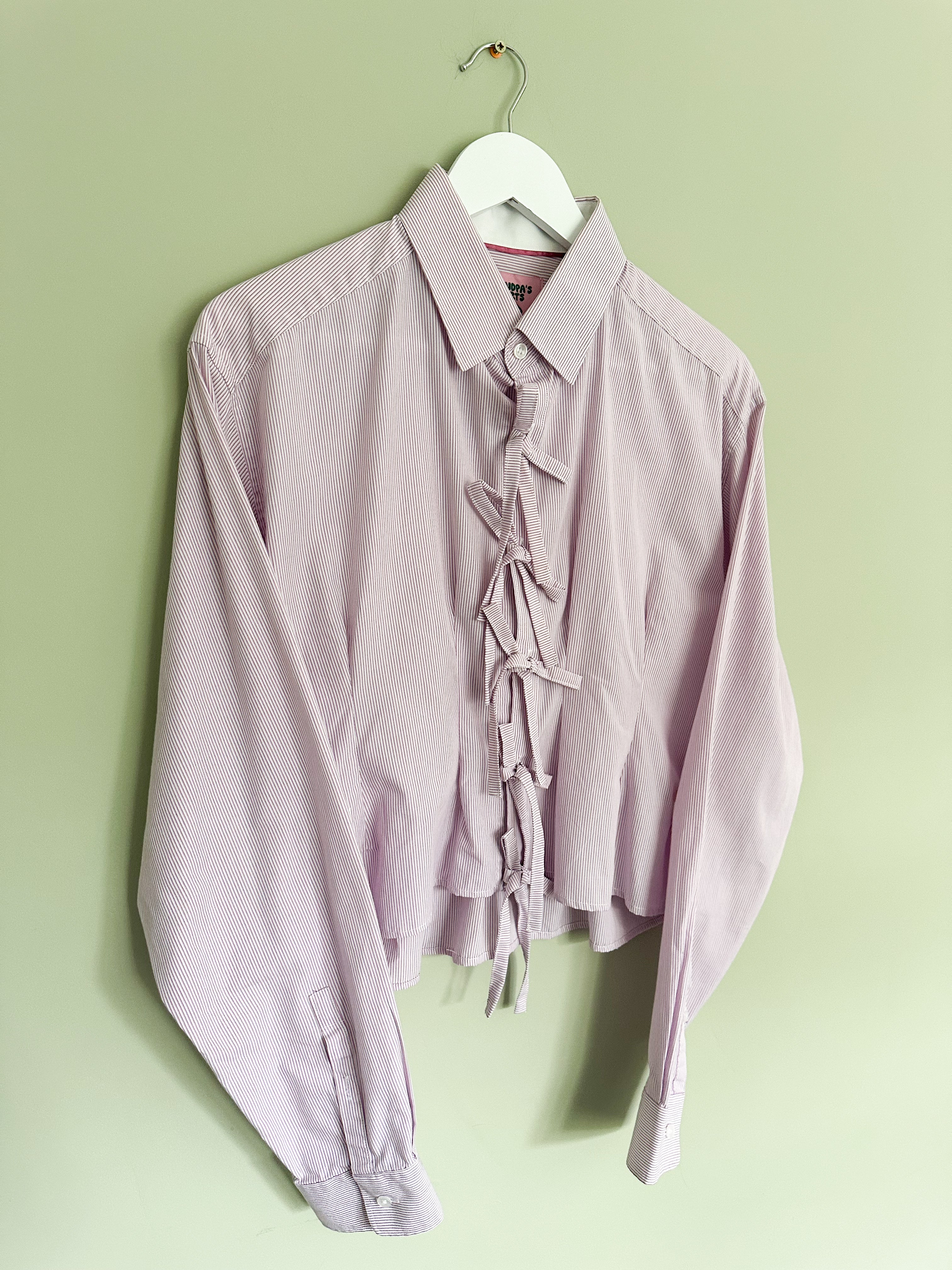 The Pink Stripe Darted Shirt from Grandpa's Shirts is a feminine take on the classic button-up. Crafted from an upcycled men's shirt, it features a flattering darted silhouette with a cinched waist and tie-front detail, reimagined in a soft pink pinstripe.