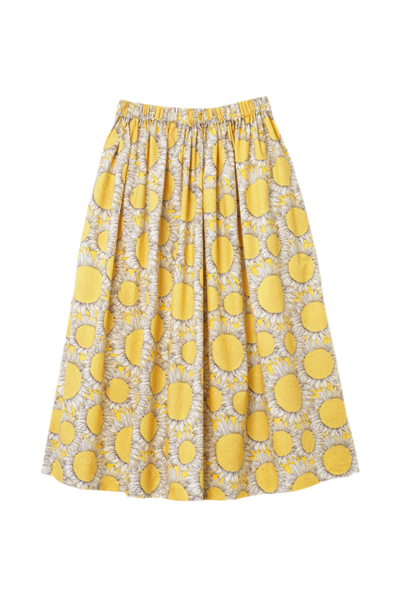 The full gathered design creates movement and flow, cut to a flattering mid-maxi length. Its bright sunflower motif brings a joyful energy to everyday styling.