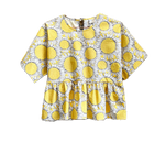 The Maya Top Liberty Sunflower is designed with a round neck and short sleeves, finished with a gathered peplum for added volume and a pin hem. The wide cut allows for a comfortable fit, while the binding at the neck and ties in the back add a stylish touch.