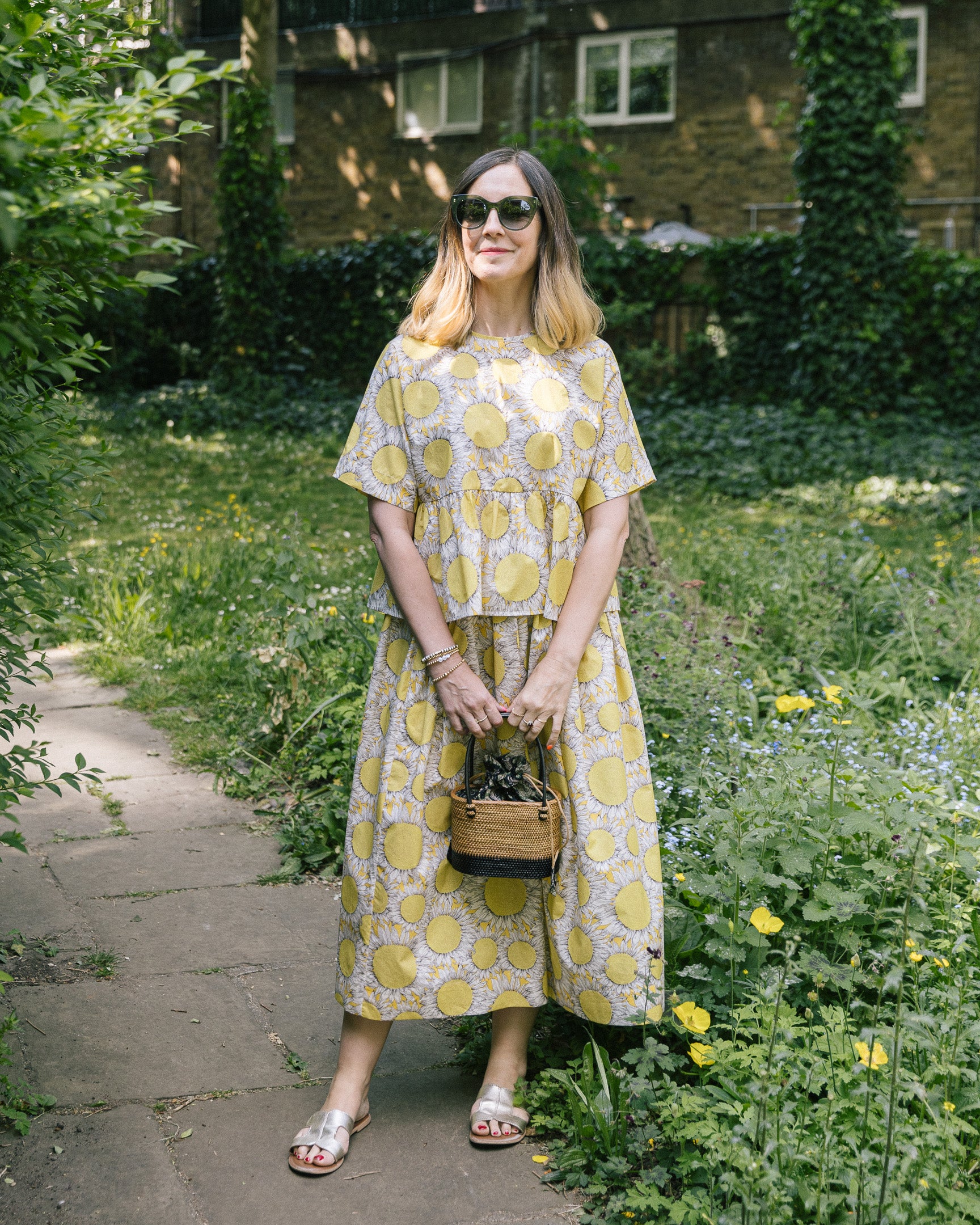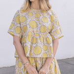 The Maya top reimagined in a beautiful sunflower print. The design has echos of block print, with drawn elements and yellow tones, printed on organic cotton poplin.