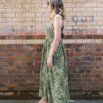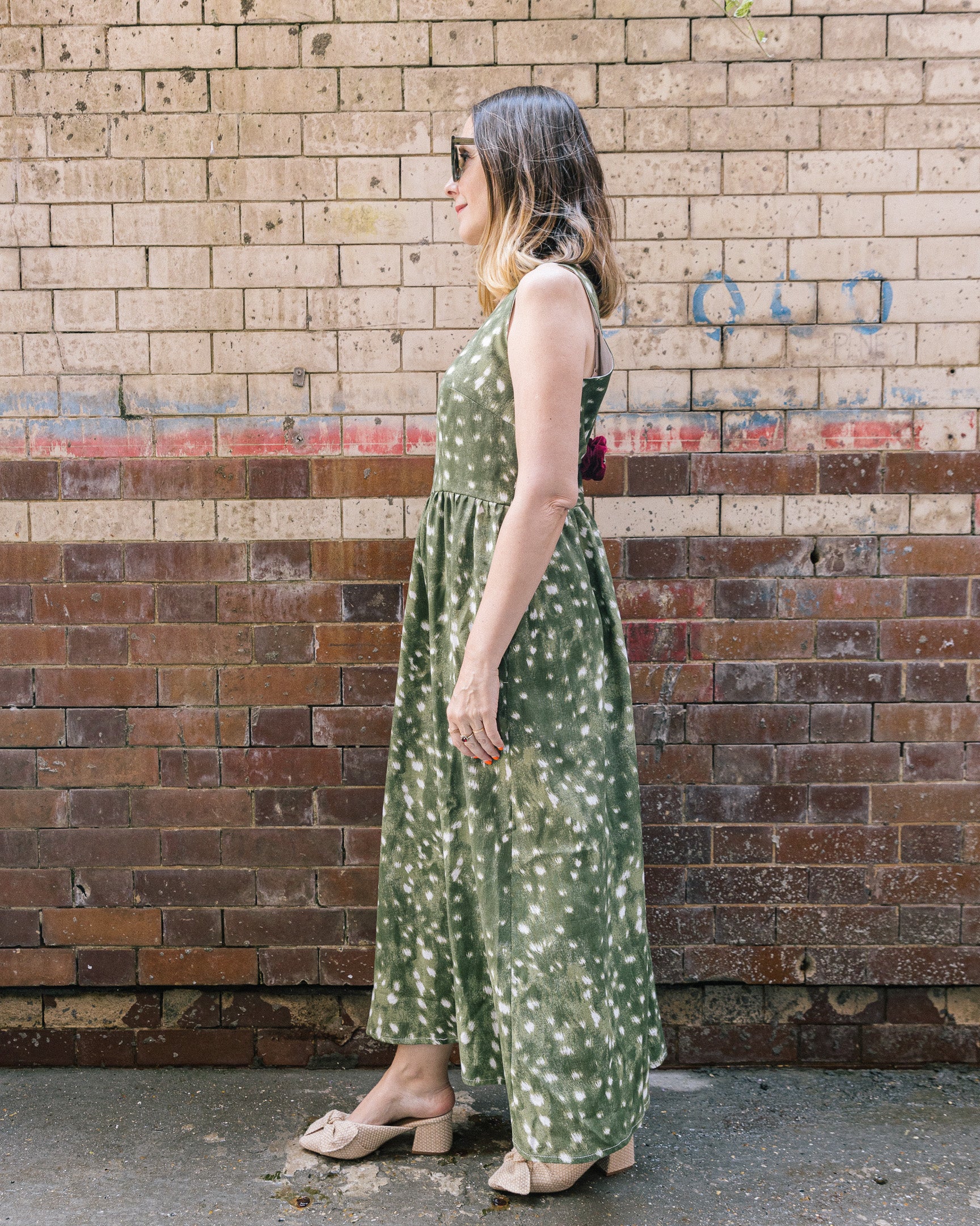 The Aletta Dress by The Well Worn has a flattering silhouette that fits gently at the waist before flaring into a full skirt. It has a round neckline at the front and back with an invisible zipper closure at the back. The Aletta dress is designed and made in Hampshire and cut from deadstock olive green, animal spot linen fabric.