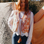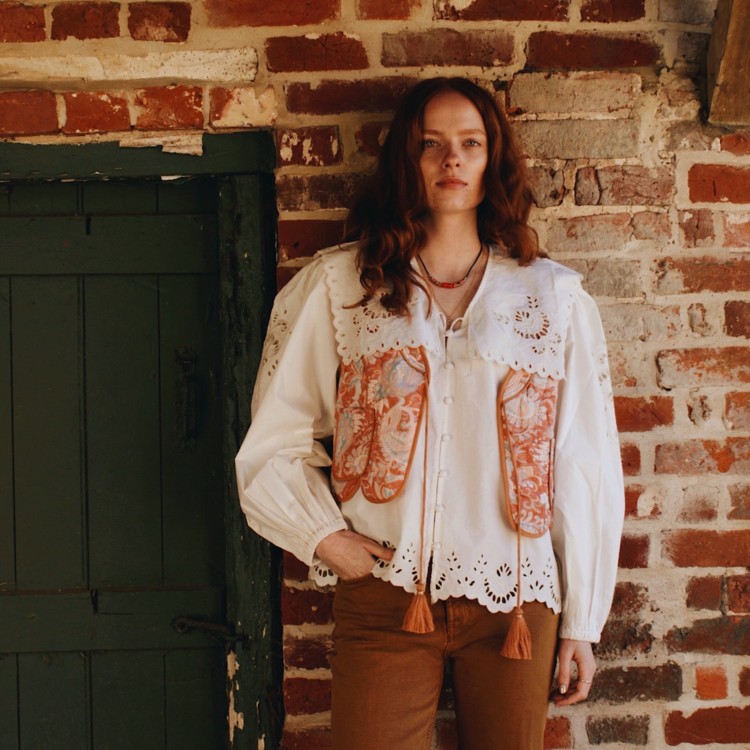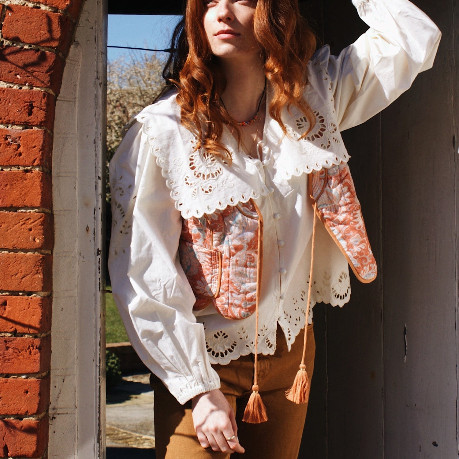 Experience the perfect blend of texture, pattern, and boho charm with the Penny Waistcoat in Summer Paisley by House of Disgrace. The quilted design adds coziness while a vibrant print evokes warm 70's nostalgia in tones of pink, peach, terracotta, baby blue, and soft lilac. Contrasting binding and piping add a vintage touch to this versatile waistcoat, perfect for enhancing any outfit.