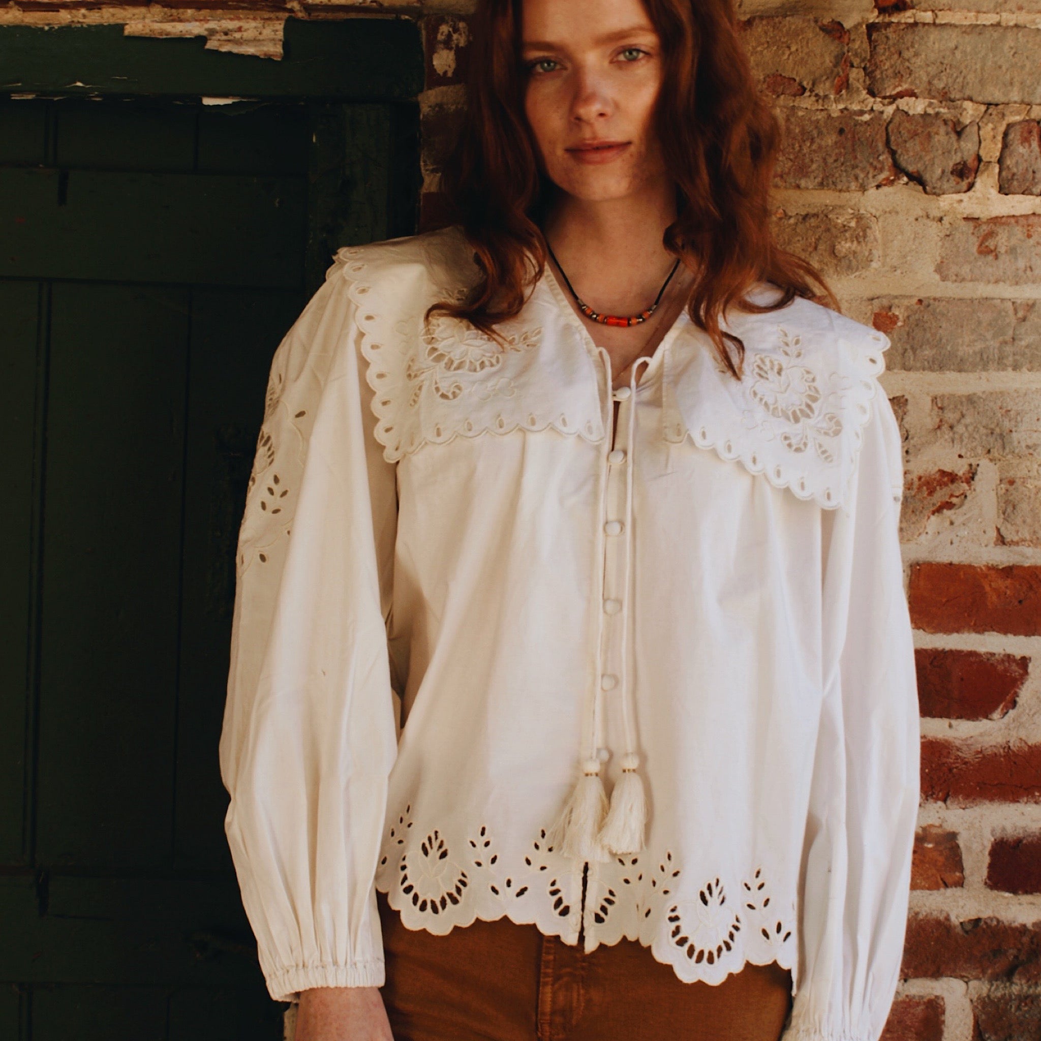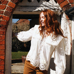 Model styling a white long sleeve blouse with an oversized collar and embroidery details.