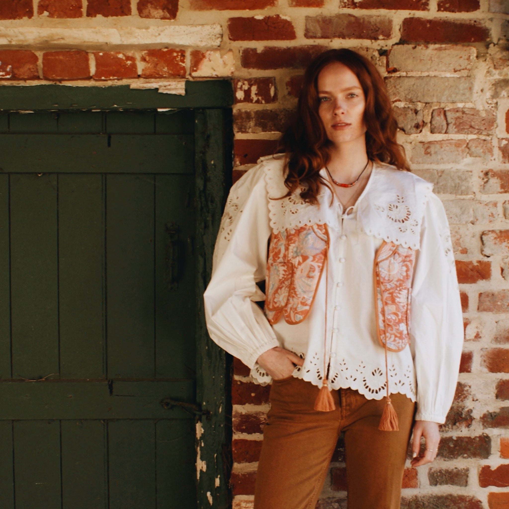 Ties and tassels at the neckline and covered front buttons elevate the look. Pair it with high-waisted denim or the Penny waistcoat for effortless, boho elegance. Daisy is 5ft 7, size 8, and wears an XS.