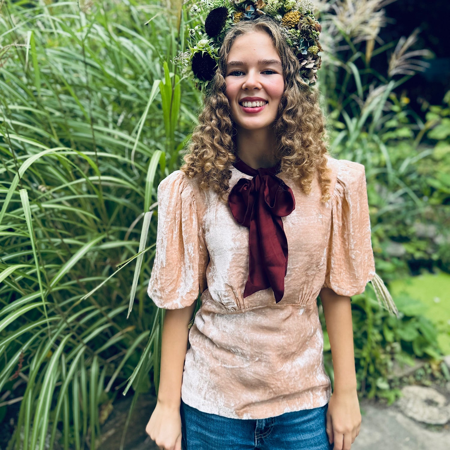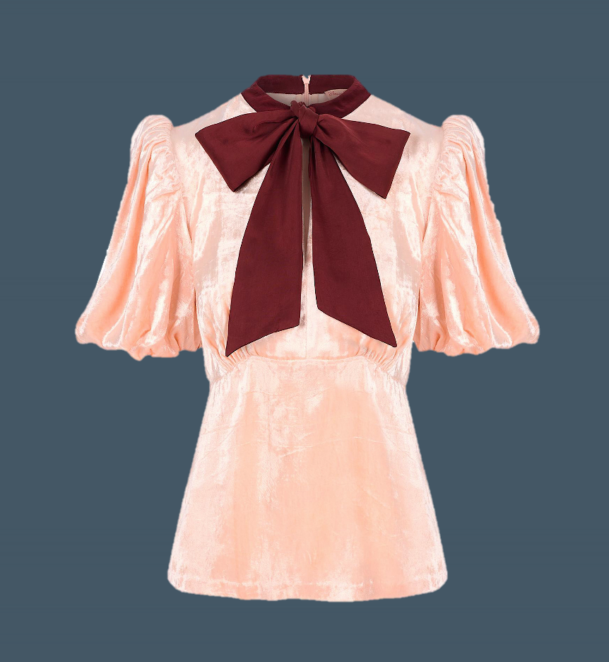 The Sophie blouse in ballet pink velvet is beautifully crafted with puffball sleeves, a fitted silhouette, and a detachable satin bow. Wear it with your favourite pair of jeans for a chic everyday look or dress it up for a glamourous event!