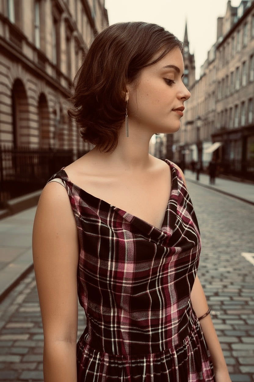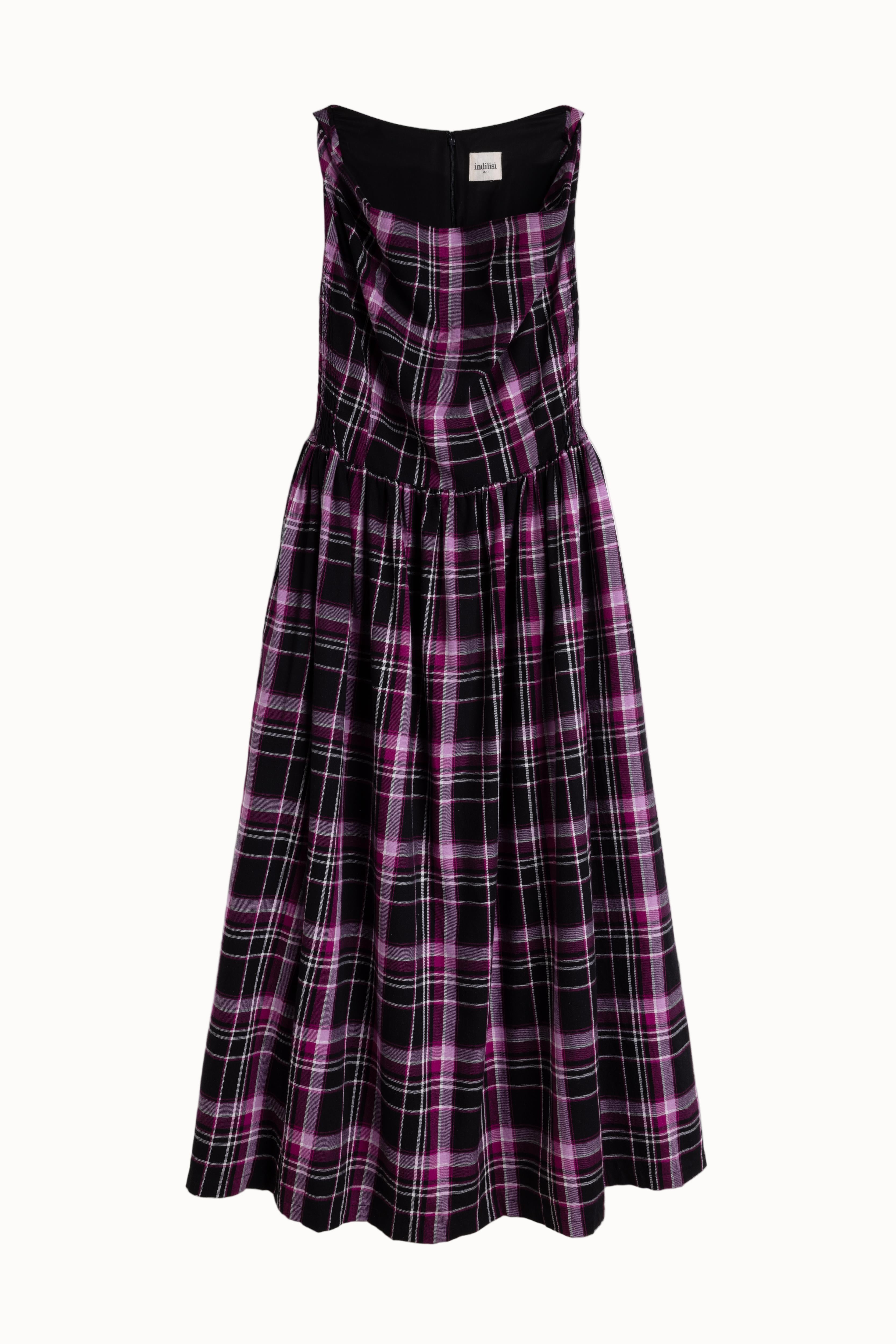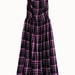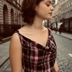 This checked maxi dress by Indilisi is a modern take on timeless tailoring. Handwoven from soft, breathable organic cotton in berry and black check, the Celia Cowl Neck Maxi Dress combines a flattering cowl neckline with an elegant drape and subtle shaping for comfort and confidence all day long.