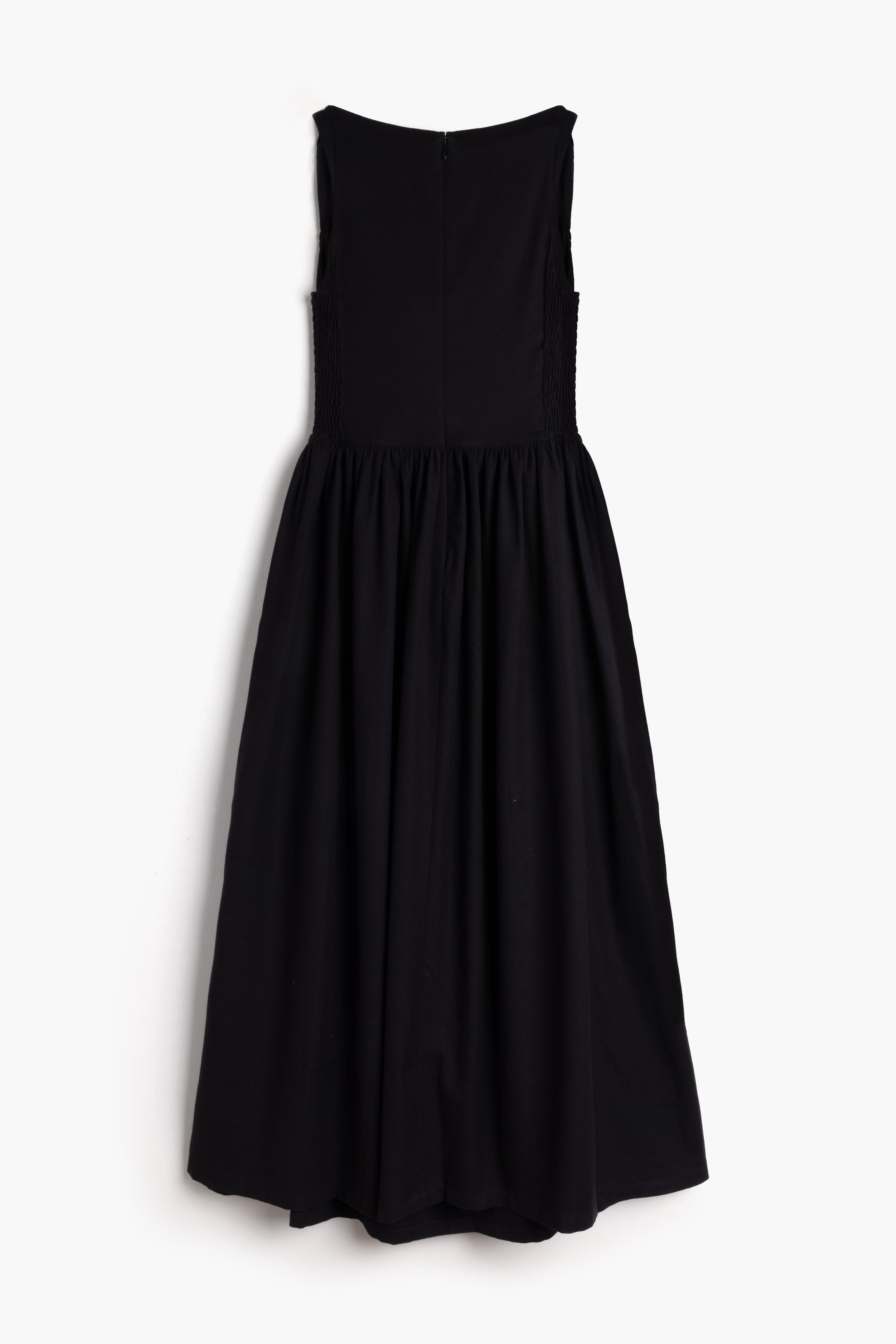 Elasticated shirring at the sides gently defines the waist while maintaining ease and comfort. Side seam pockets, an invisible back zip, and hand-finishing by skilled artisans in Bangladesh reflect Indilisi’s commitment to craftsmanship and slow, considered design.