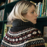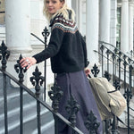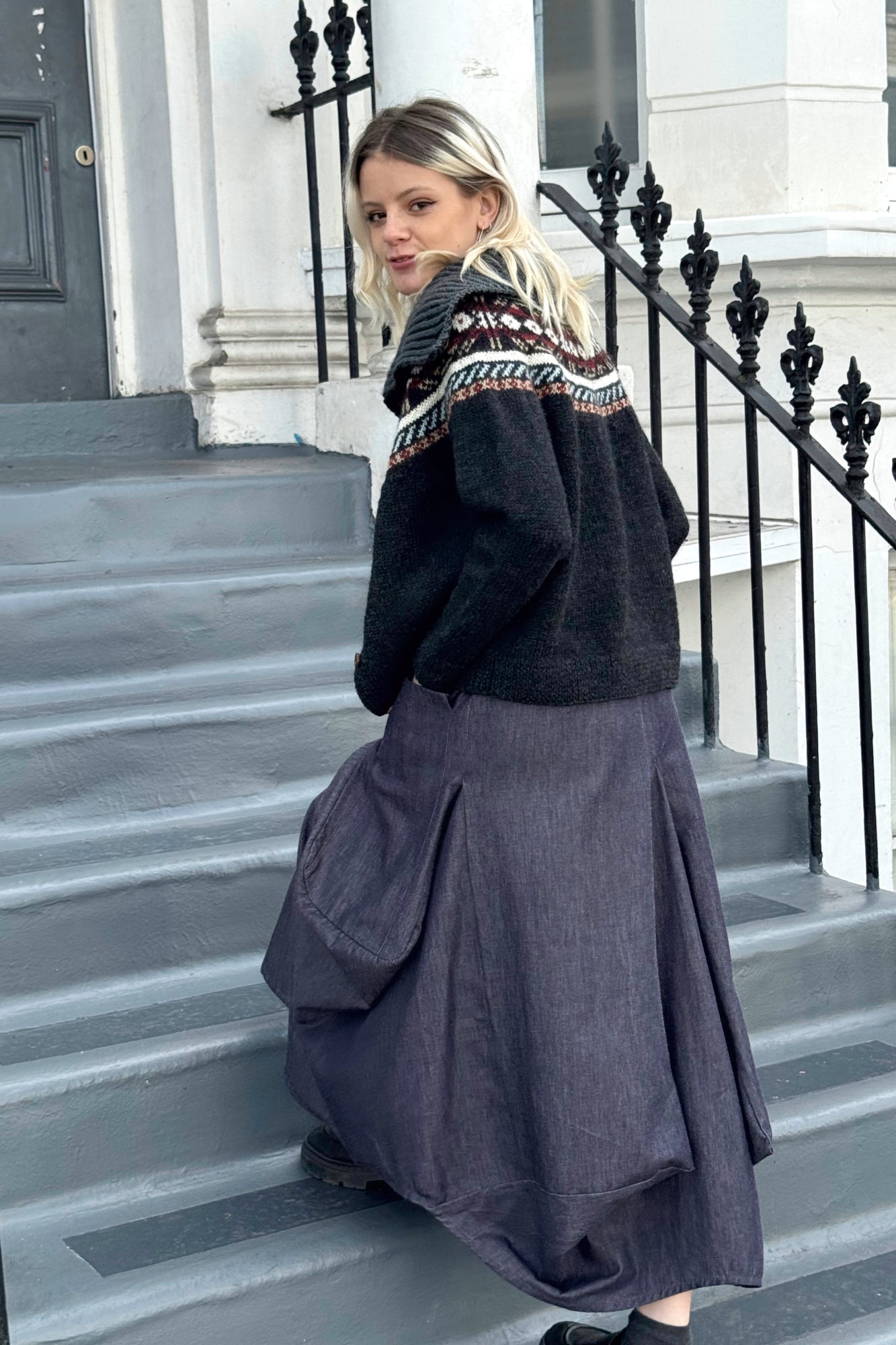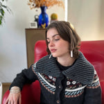 This Fair Isle cropped cardigan by Indilisi combines traditional hand-knitting with modern versatility. The Phoebe Fair Isle Cropped Cardigan in dark grey features a soft mohair-lined funnel neck and a distinctive multi-pattern Fair Isle design, offering warmth, comfort, and artisanal charm for the colder months.