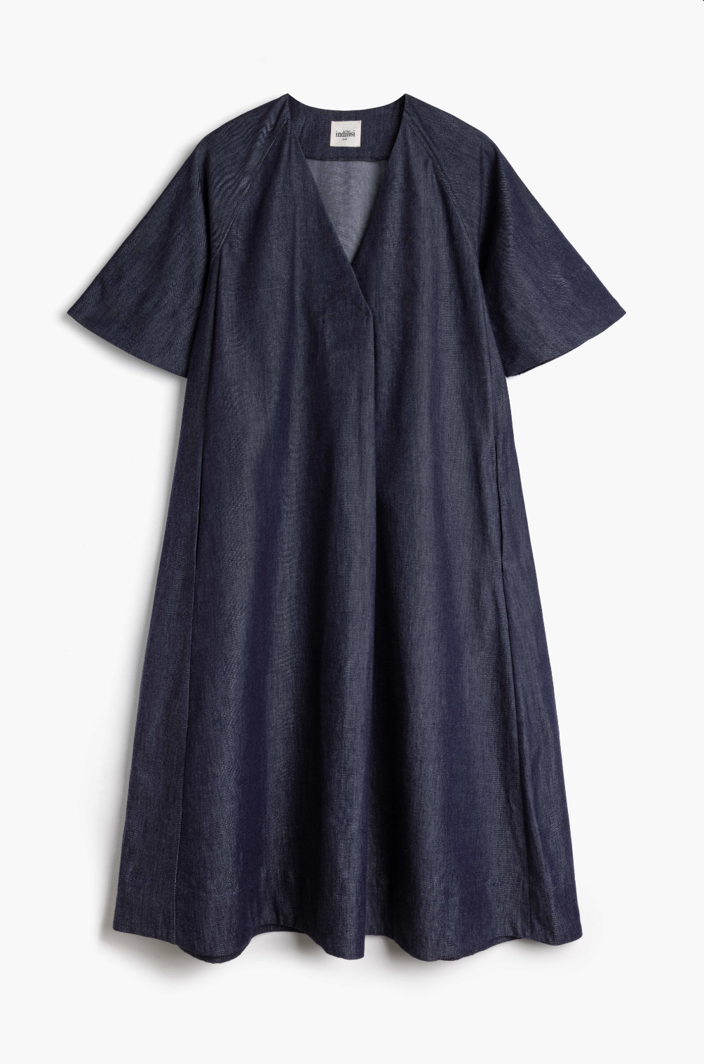 This denim dress by Indilisi is a modern wardrobe classic. Crafted in London from 100% organic cotton chambray, the Rebecca Denim Dress combines a flattering midi length and V-neckline with a relaxed structure and adjustable tie-belt for a naturally elegant silhouette that suits every shape.
