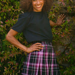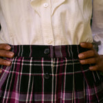This check midi skirt by Indilisi is handwoven in a bold Berry & Black check. A pleated, button-front skirt in organic cotton, it blends statement pattern with everyday ease and styles perfectly as a co-ord.