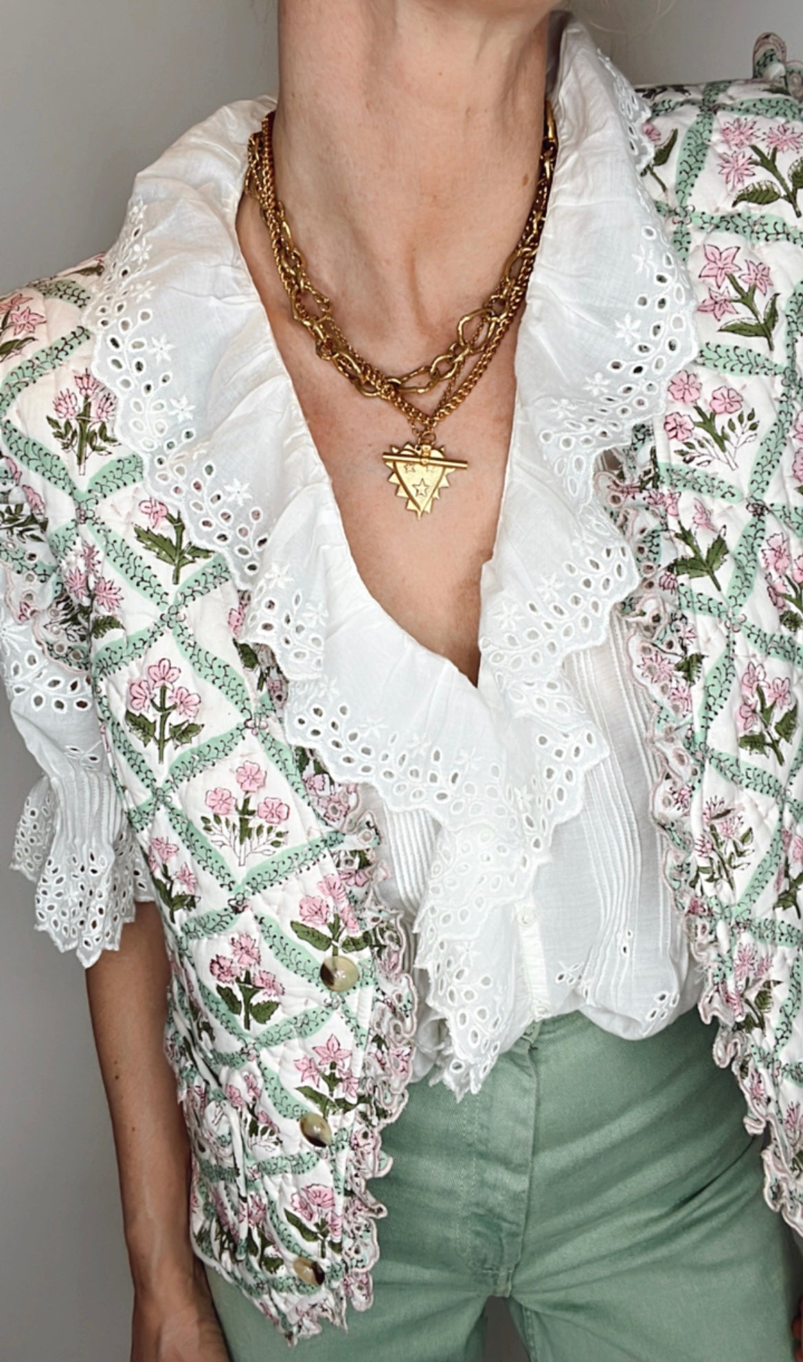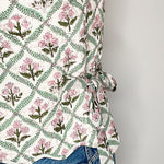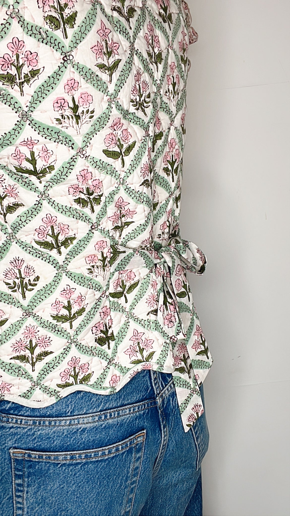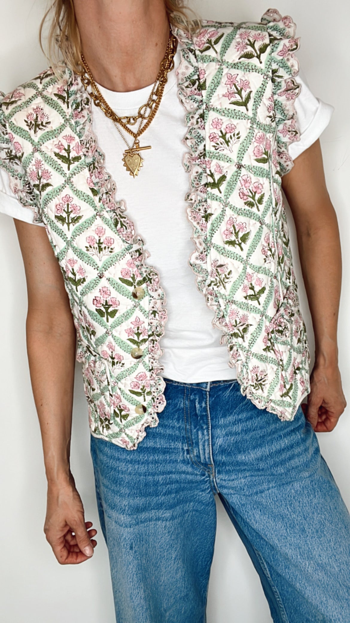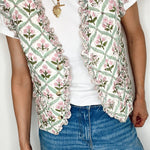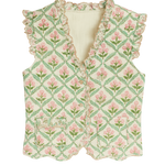 The Dianne Quilted Waistcoat is a feminine quilted waistcoat in a white woodblock print with soft pinks and greens, perfect for year-round layering.