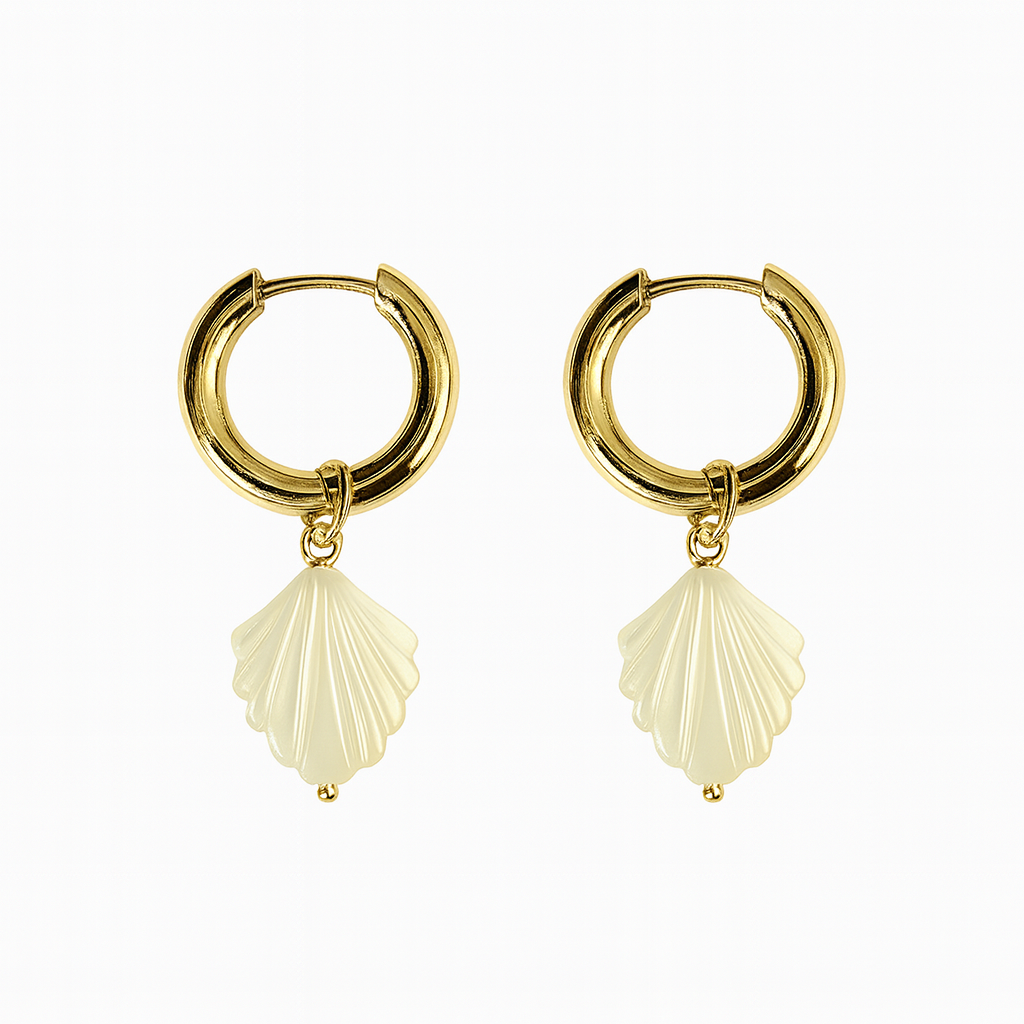 Stylish gold plated hoop earrings adorned with shimmering mother of pearl elements.