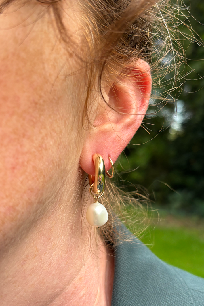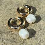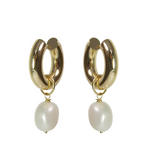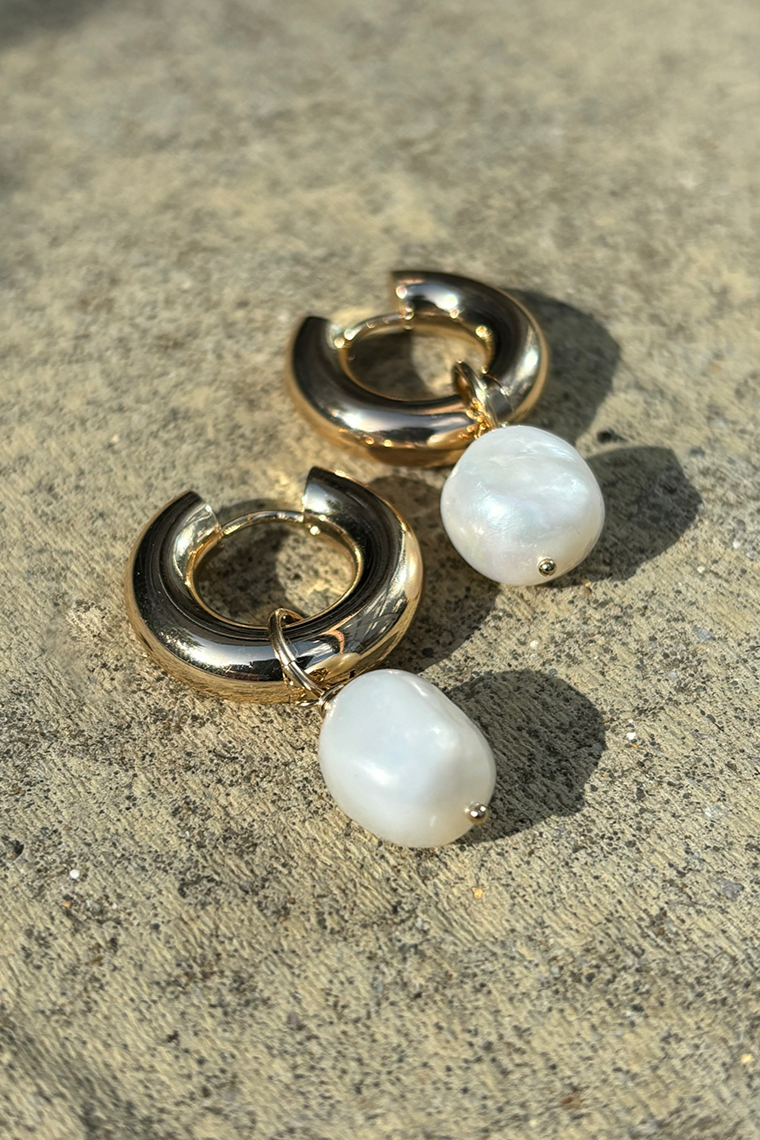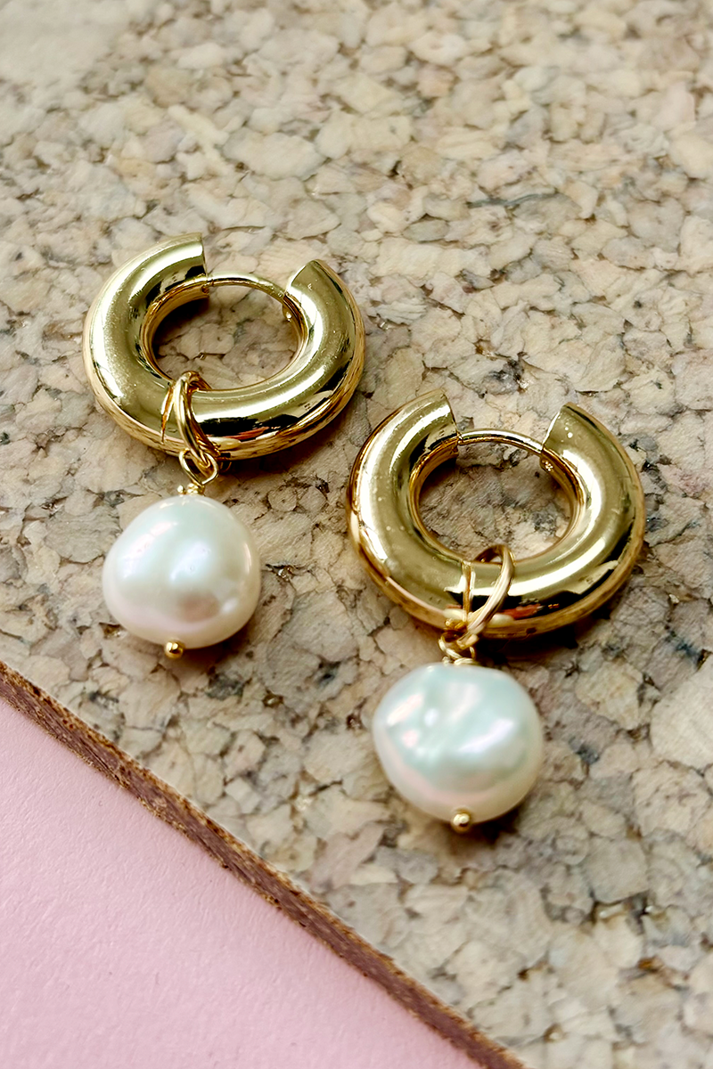 These gold pearl hoop earrings are wonderfully chunky and stylish. Crafted from plated stainless steel, the glossy hoops can be worn on their own or with the charming pearl accents. Each pearl is intentionally imperfect, giving these earrings a one-of-a-kind appeal that may vary slightly from the photo.