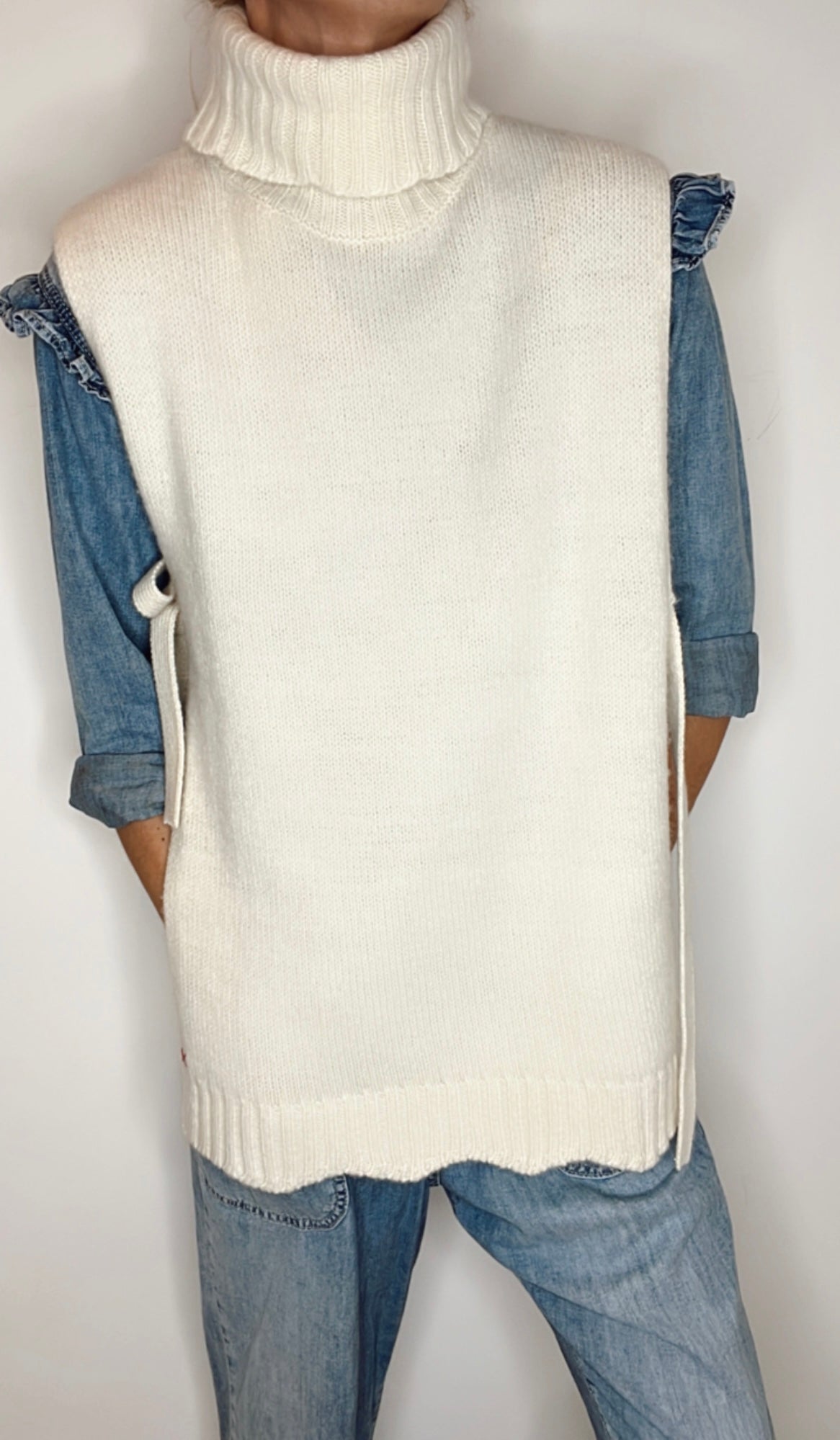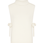 The high ribbed roll neck adds a structured finish, while side ties create adjustable ease — perfect for layering over shirts, blouses, or dresses.