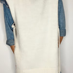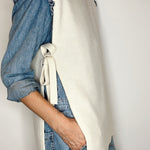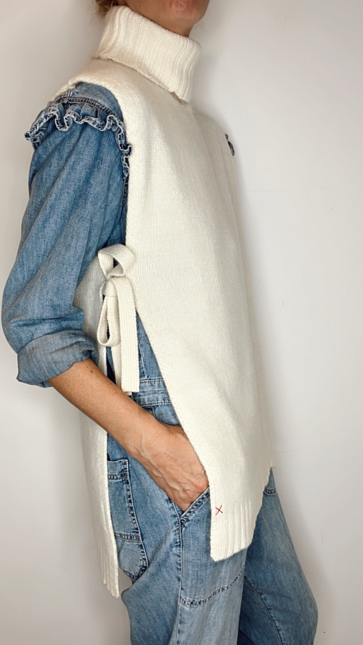 The High Neck Tie Side Tabard in Snowflake by 46 Stitch is a modern layering knit, designed for effortless styling through the seasons. Its clean lines and soft neutral shade make it a timeless wardrobe essential.
