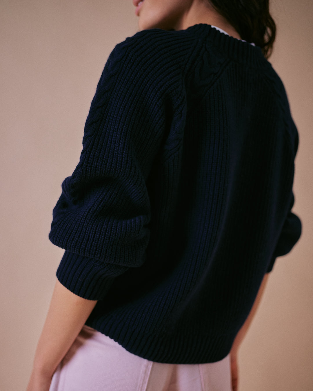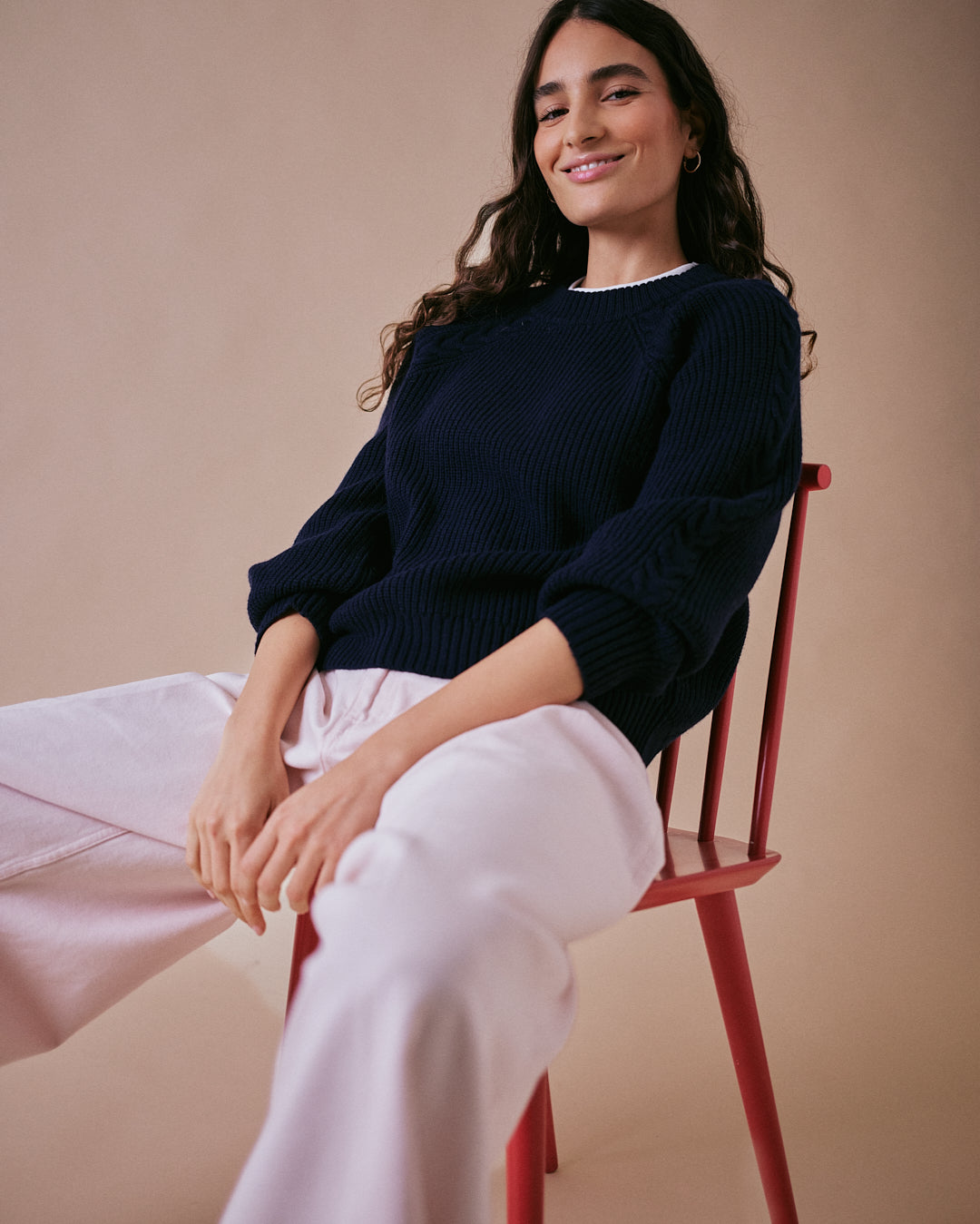 Inspired by traditional fisherman knits, this jumper features intricate cable detailing along the sleeves and a modern crew neckline for a flattering, easy silhouette. The navy tone adds a versatile, refined finish that pairs beautifully with denim or tailoring.