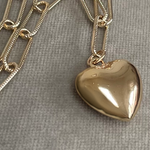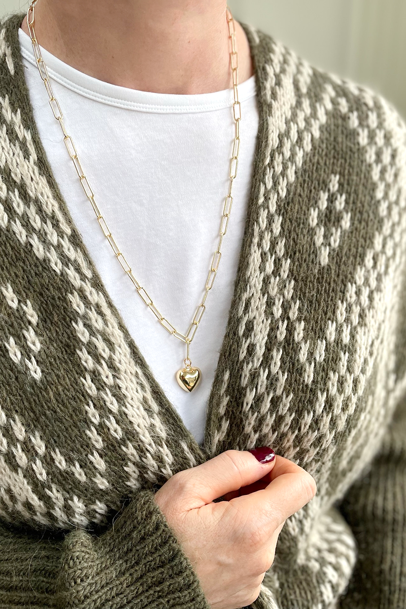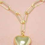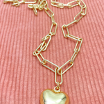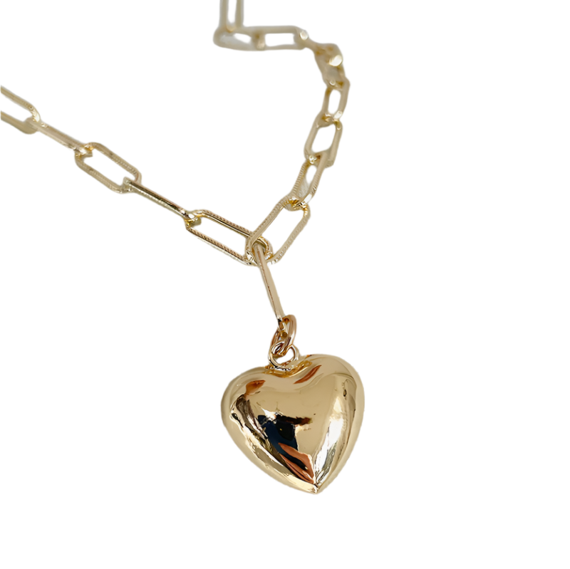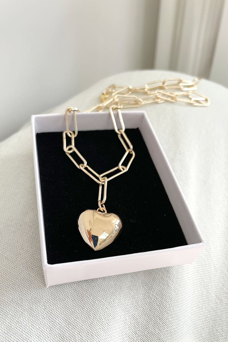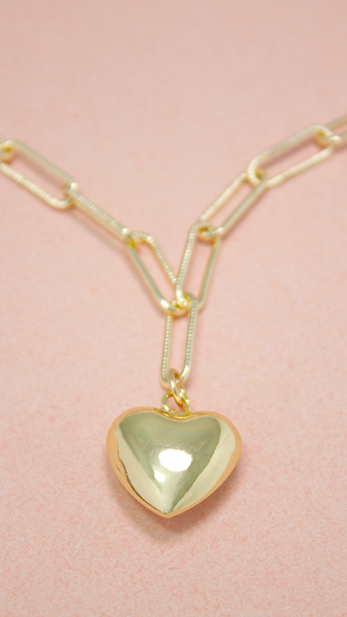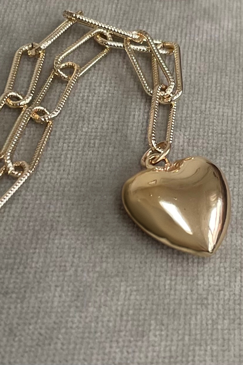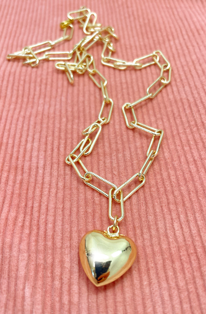 Add a touch of playful elegance to your wardrobe with this chunky heart pendant necklace. The charming gold pendant hangs from a delicate, textured gold-plated chain. Perfect for layering with other necklaces or wearing alone with an open shirt. Show your love by gifting this stylish piece to someone special.