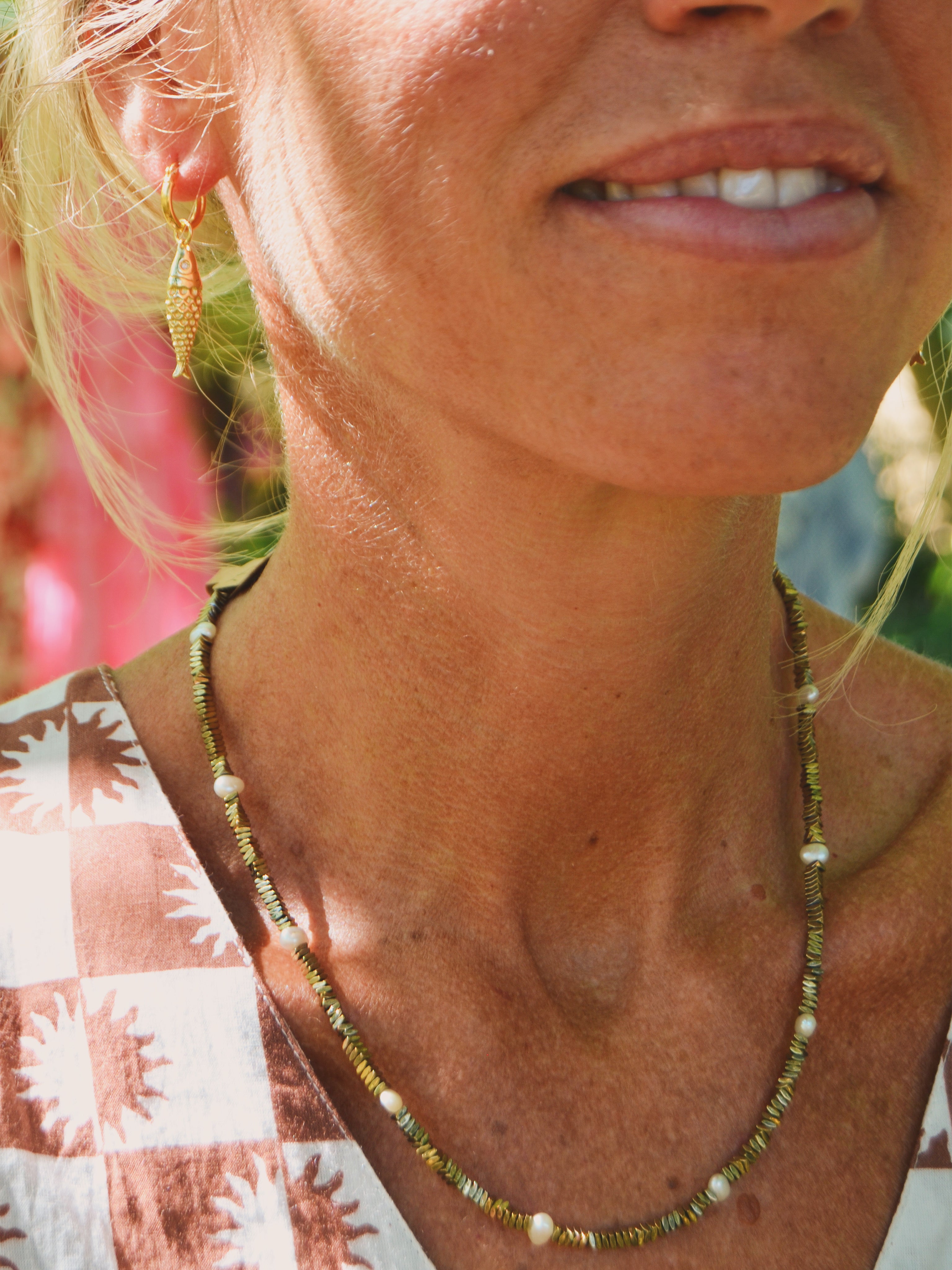 The Gold Hematite & Pearl Spacer necklace by Bella Riley. Exclusive to Percy Langley. Handmade in Hackney by jeweller Bella Riley, maker of joyful Demi-fine jewellery. Bella’s designs beautifully balance classic and edgy. Gold hematite beads with freshwater nugget pearl spacers. Shimmers and move beautifully replicating a traditional gold chain. Finished with gold-plated clasp lined with the signature Bella Riley neon glass beads.