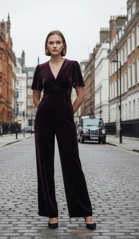 Made from a premium viscose velvet blend, this jumpsuit offers a beautifully soft drape with a subtle sheen. The rich aubergine tone adds depth and sophistication for special occasions.