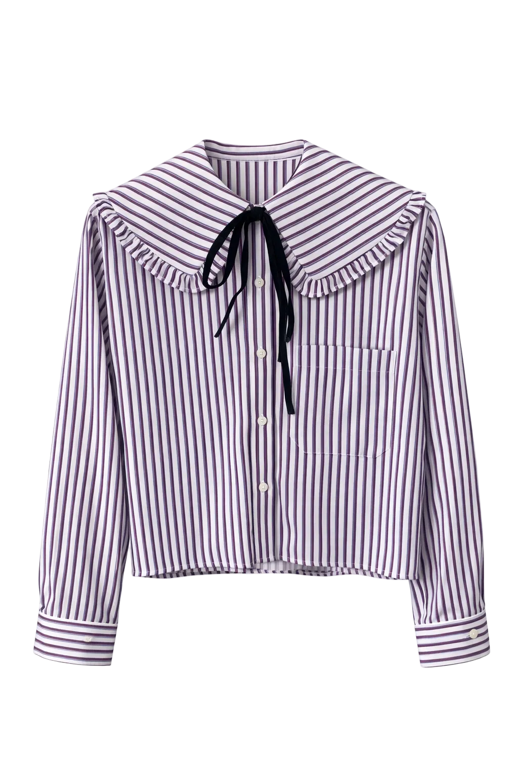 The oversized frill collar frames the neckline with soft structure, while the black velvet tie adds contrast, texture and depth. Finished with gathered sleeves, a relaxed cut and matching striped cuffs for a refined, elevated look.