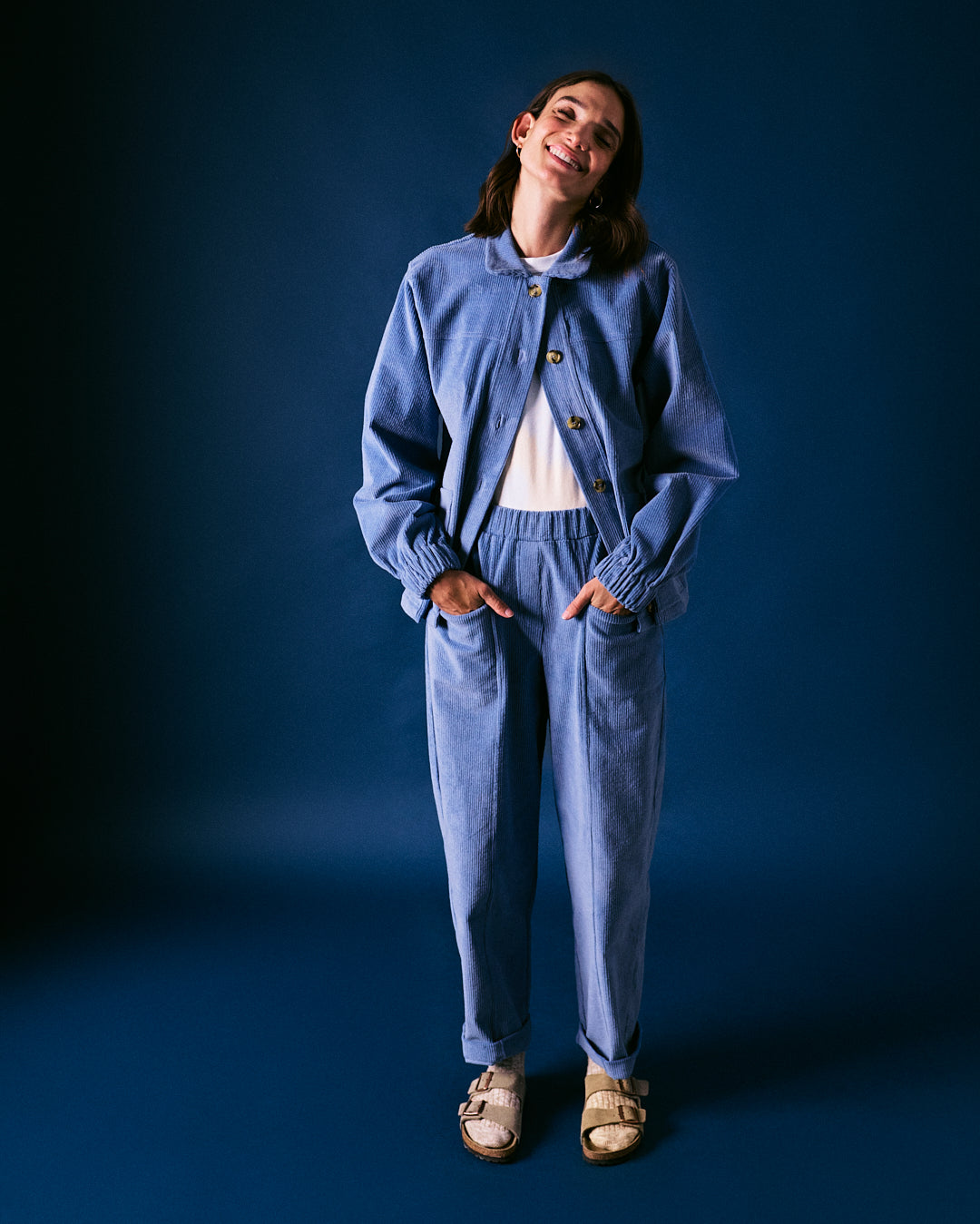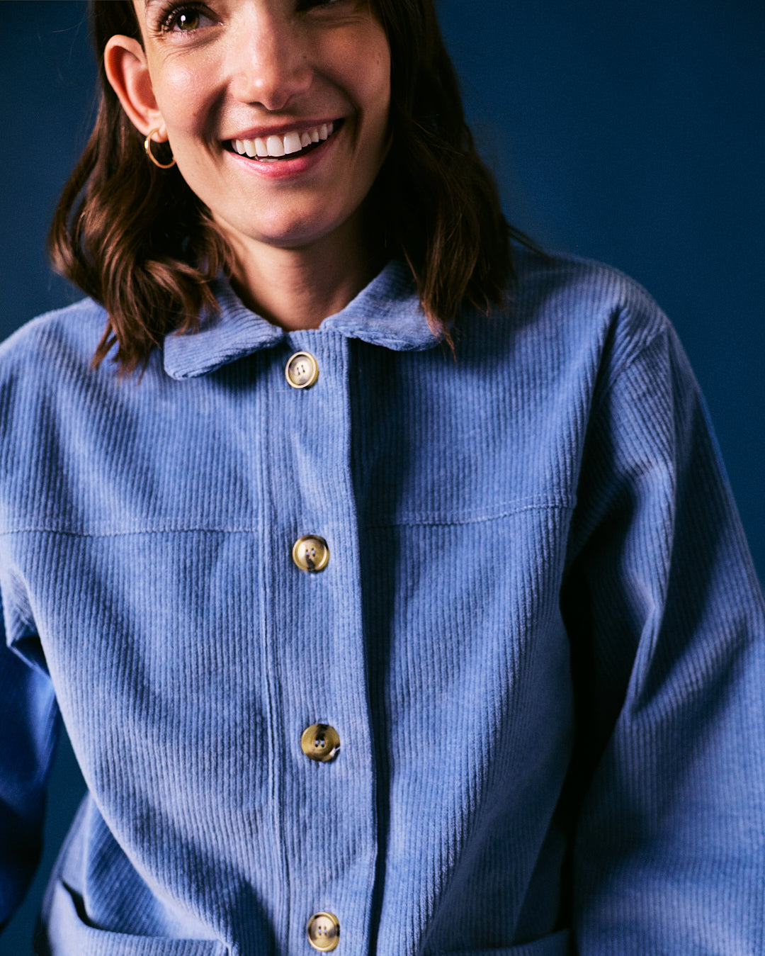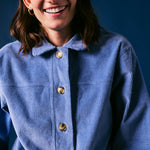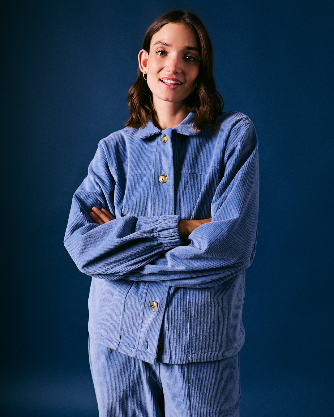 This blue cord jacket is crafted in Portugal using high-quality corduroy for lasting comfort and texture. The cropped silhouette and button-through design give it a relaxed yet refined feel, perfect for layering season after season.