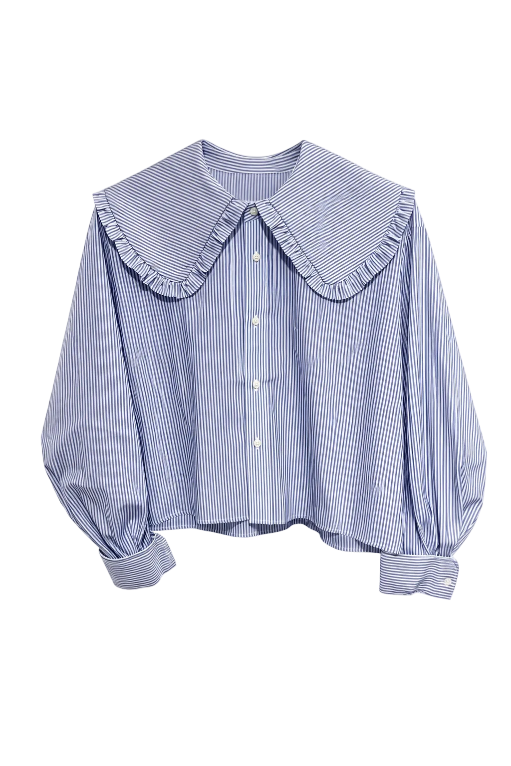 The oversized statement collar, trimmed with soft frills, adds playful volume and elegance. With a relaxed silhouette, full sleeves and button cuffs, the fit is flattering, comfortable and effortlessly wearable.