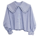 The Blue Stripe Shirt with Big Collar by Grandpa’s Shirts is a beautifully reworked upcycled design, transformed from a reclaimed men’s shirt into a standout everyday piece. Its oversized frill collar brings a fresh, modern take to classic shirting.