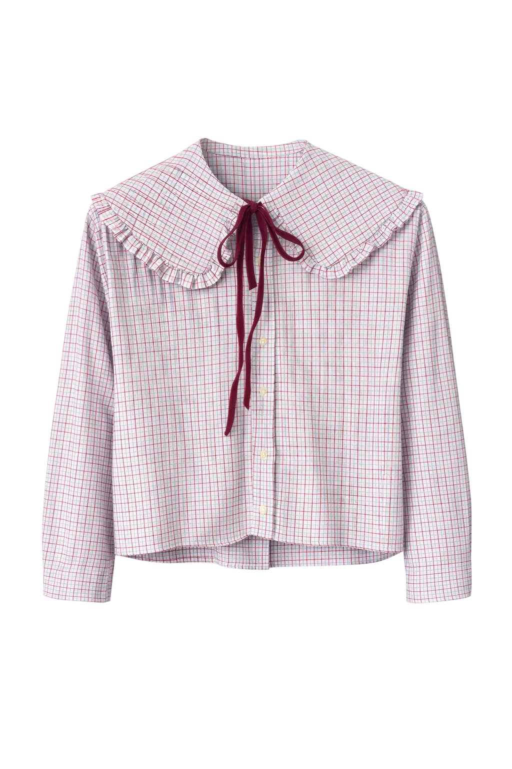 The Red and Blue Check Shirt with Big Collar & Velvet Neck Tie by Grandpa’s Shirts is a beautifully reworked upcycled piece, transformed from an original men’s shirt into a playful, feminine silhouette. Its oversized frill collar and deep red velvet tie bring a romantic, standout finish to a classic checked cotton shirt.