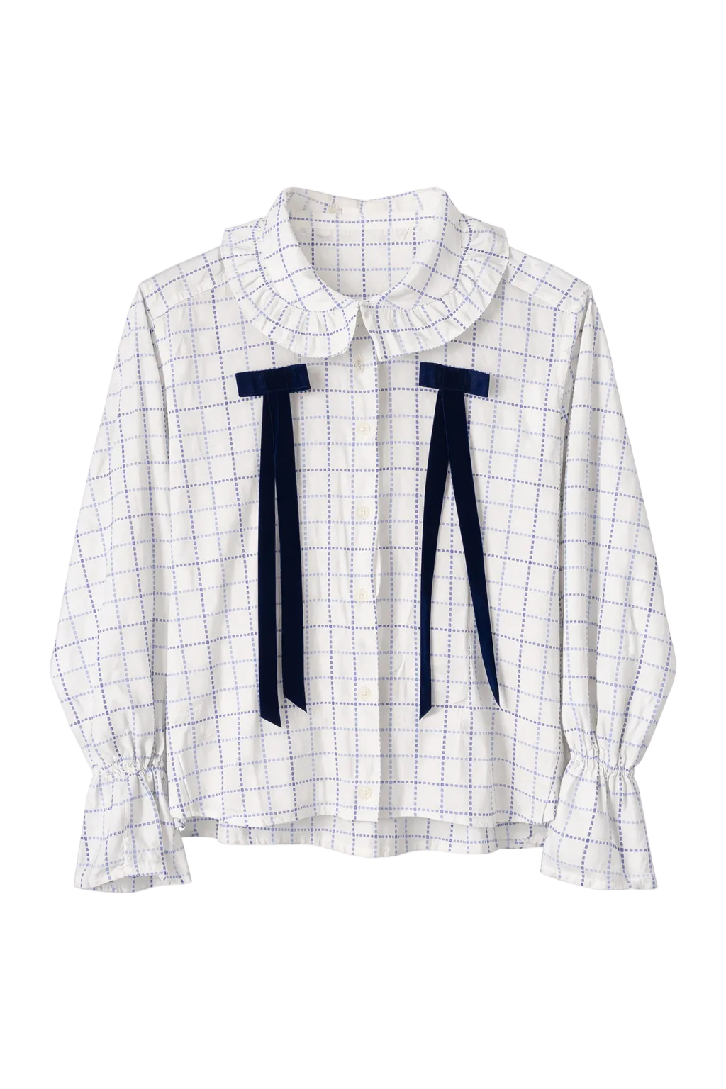 The White and Blue Check Shirt with Velvet Bows by Grandpa’s Shirts is a charming upcycled design, transformed from an original men’s shirt into a playful, feminine silhouette. Featuring a frilled Peter Pan collar and navy velvet bow ties, it brings a whimsical touch to classic shirting.