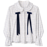 The gently ruffled collar adds soft structure, while the long navy velvet ties offer contrast and elegance. Gathered sleeves and subtle cuff details complete the look, making it a standout everyday piece.