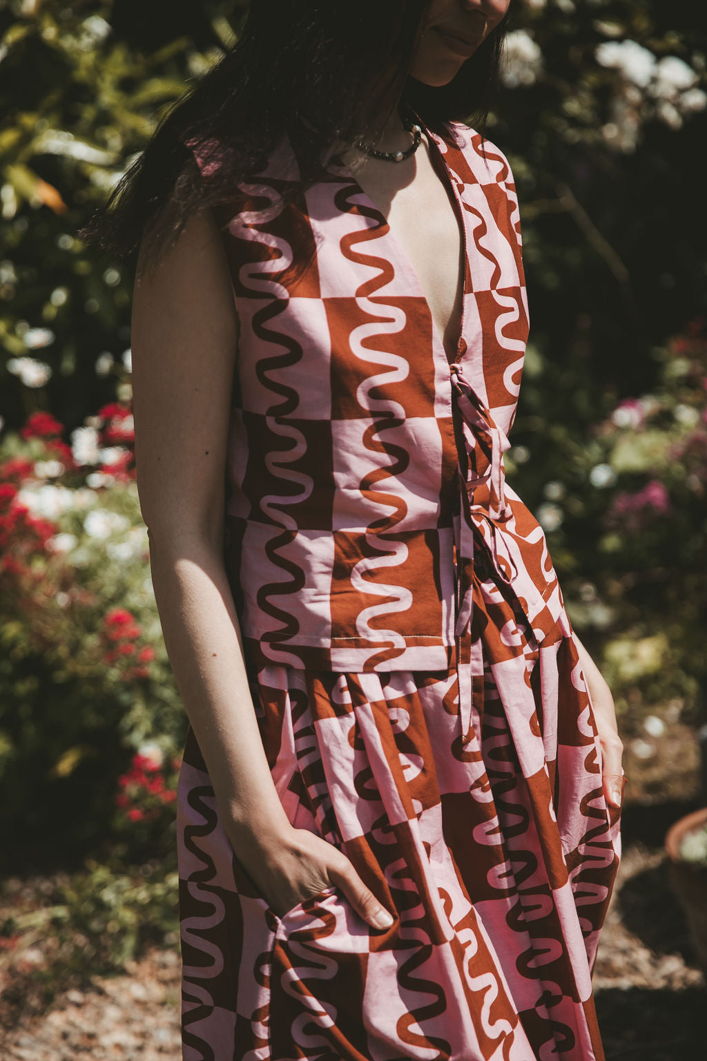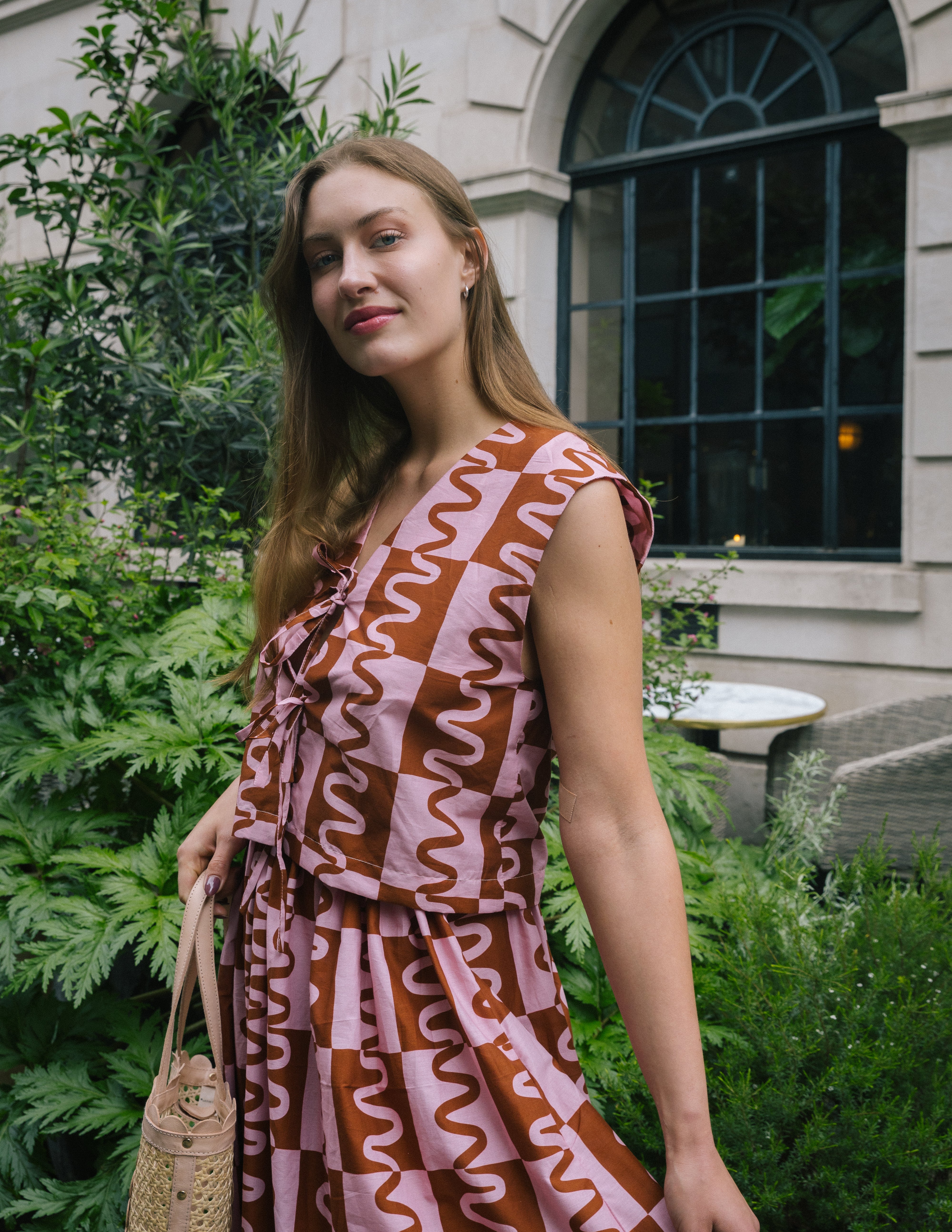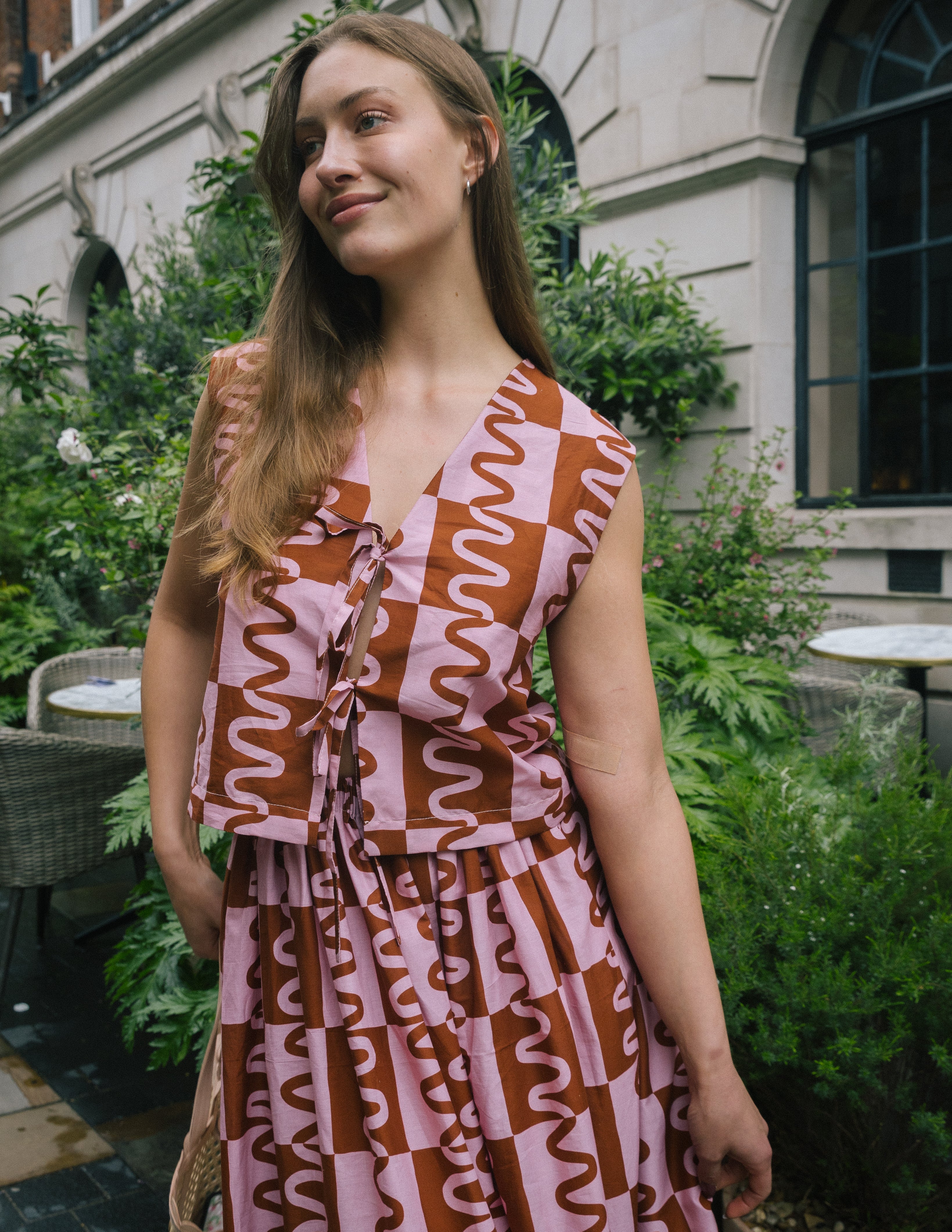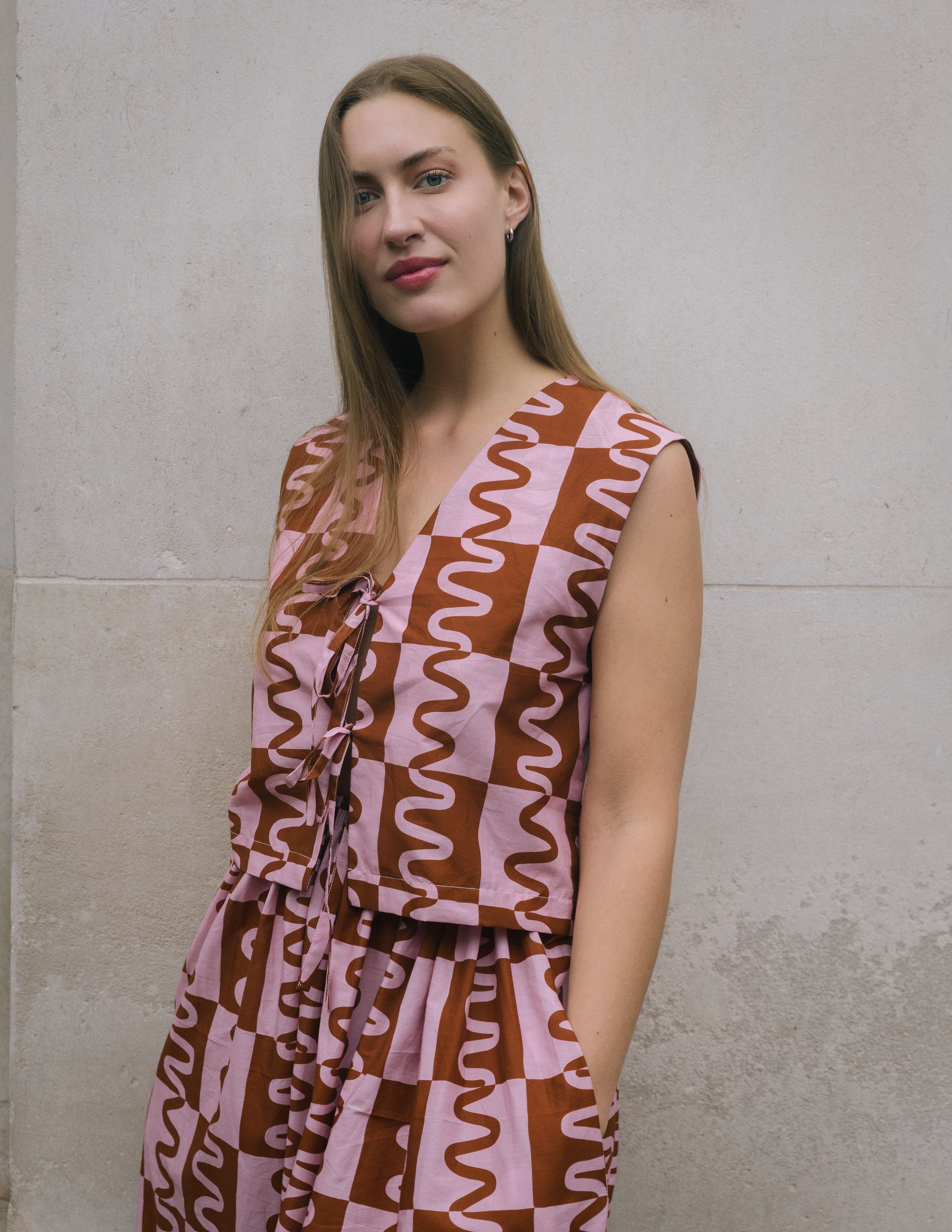 The Gracie New Wave Bow Vest is handmade in London from deadstock 100% cotton chequerboard pink and brown fabric. This versatile tie front top makes a great layering piece or can be worn on its own as a beautiful high summer top.