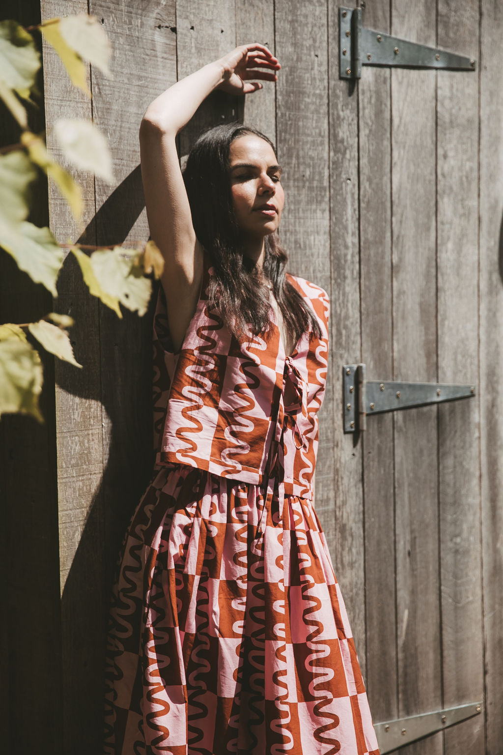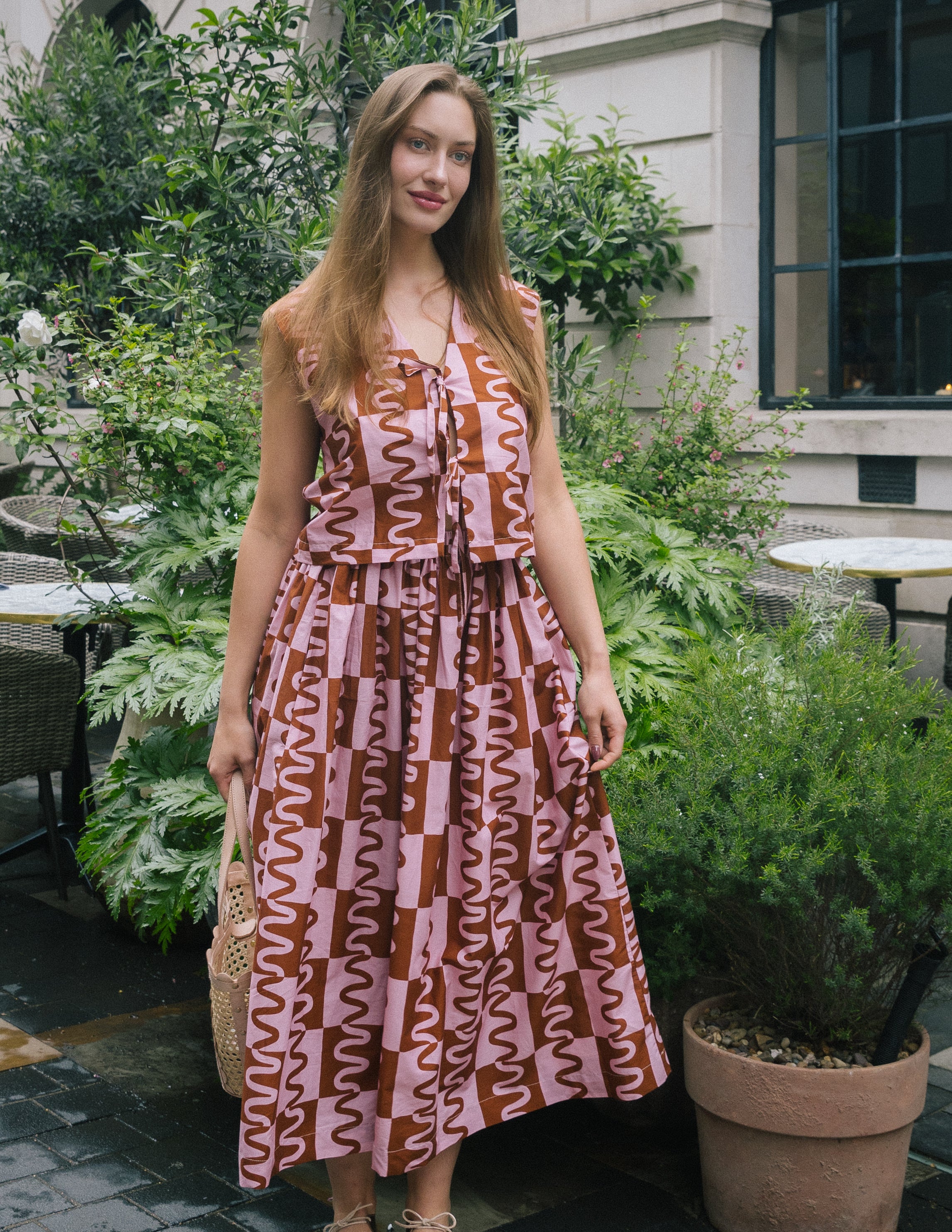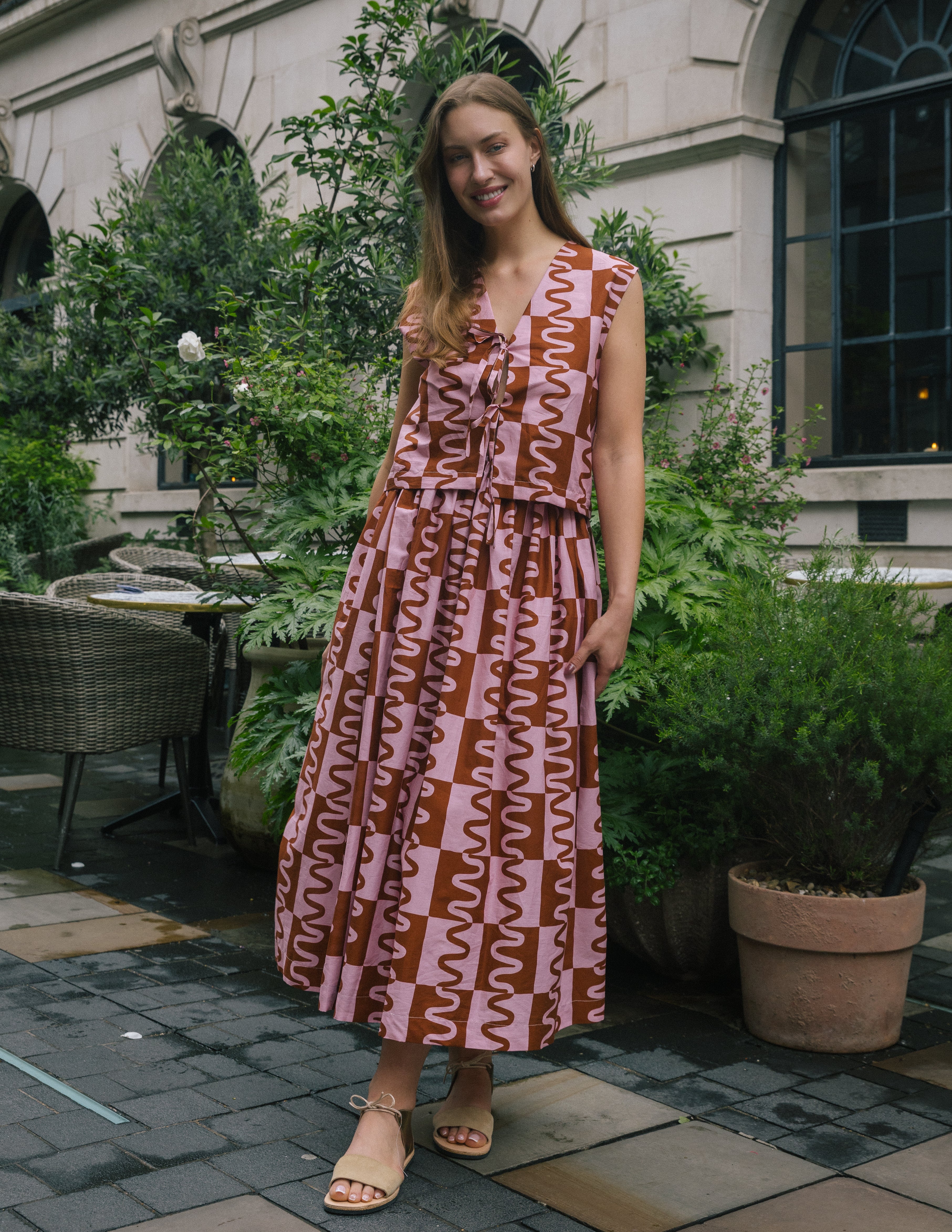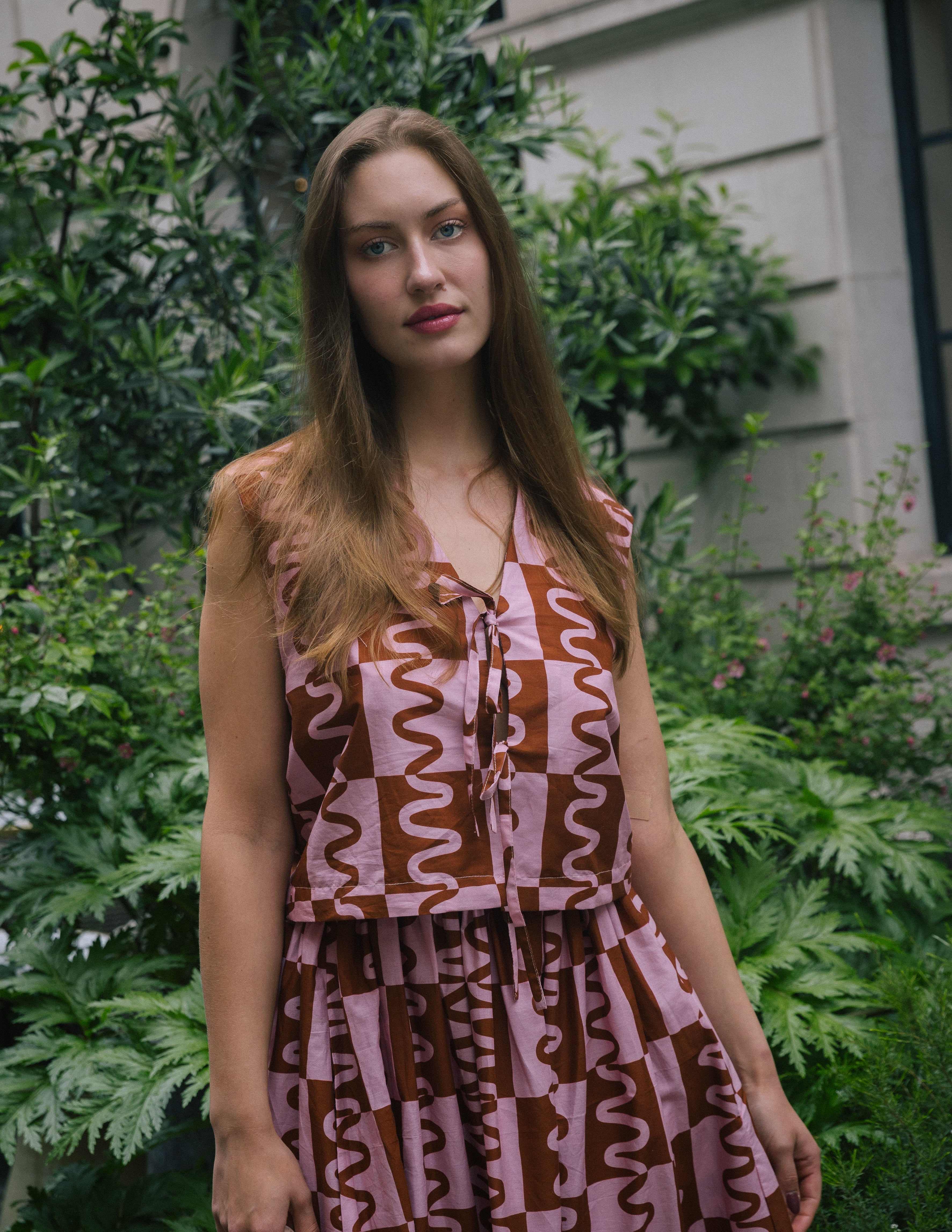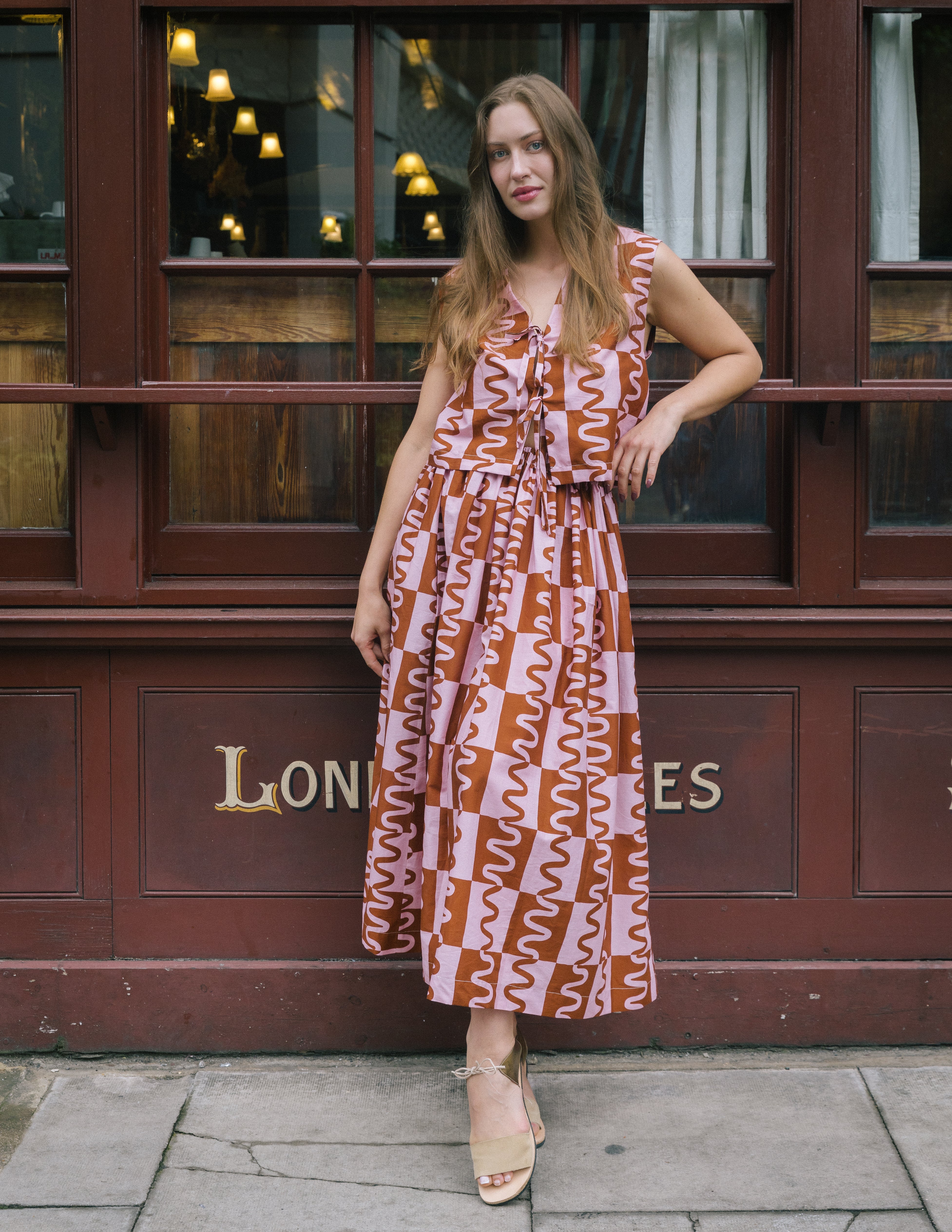The Gracie New Wave Bow Vest is handmade in London from deadstock 100% cotton chequerboard pink and brown fabric. This versatile tie front top makes a great layering piece or can be worn on its own as a beautiful high summer top.