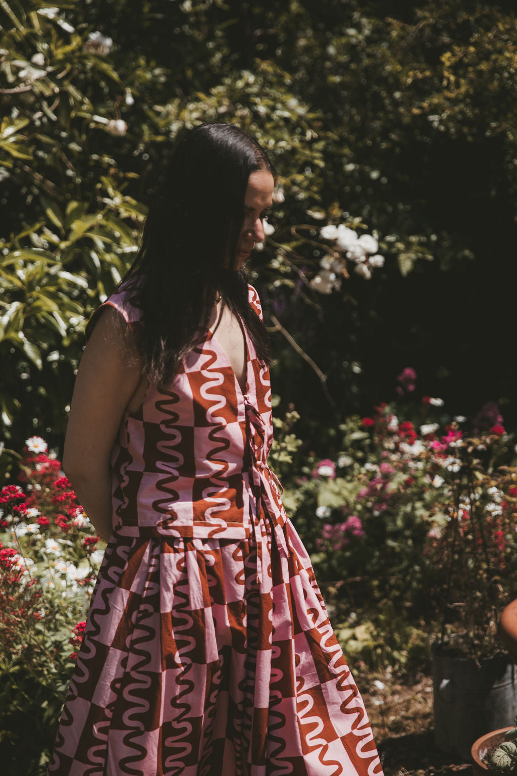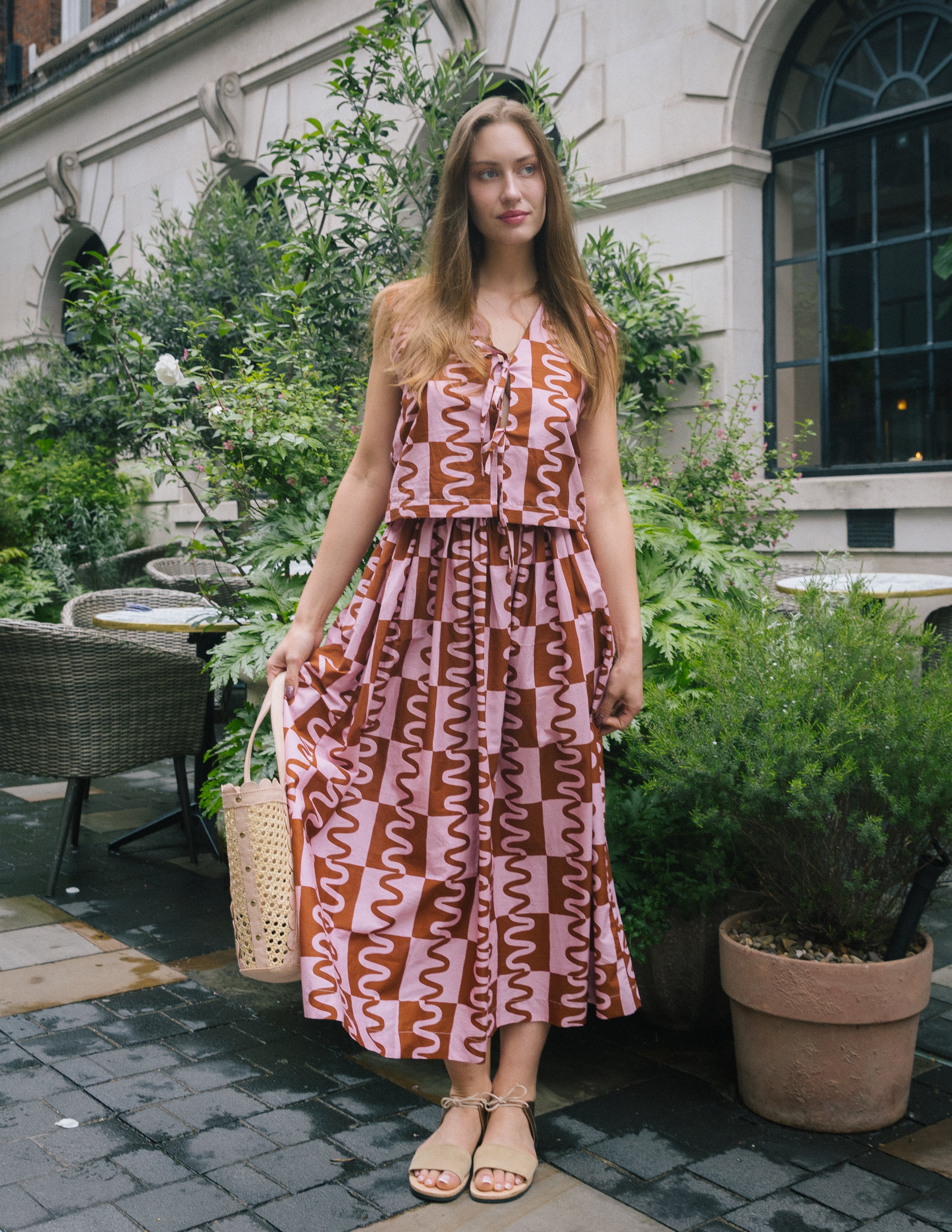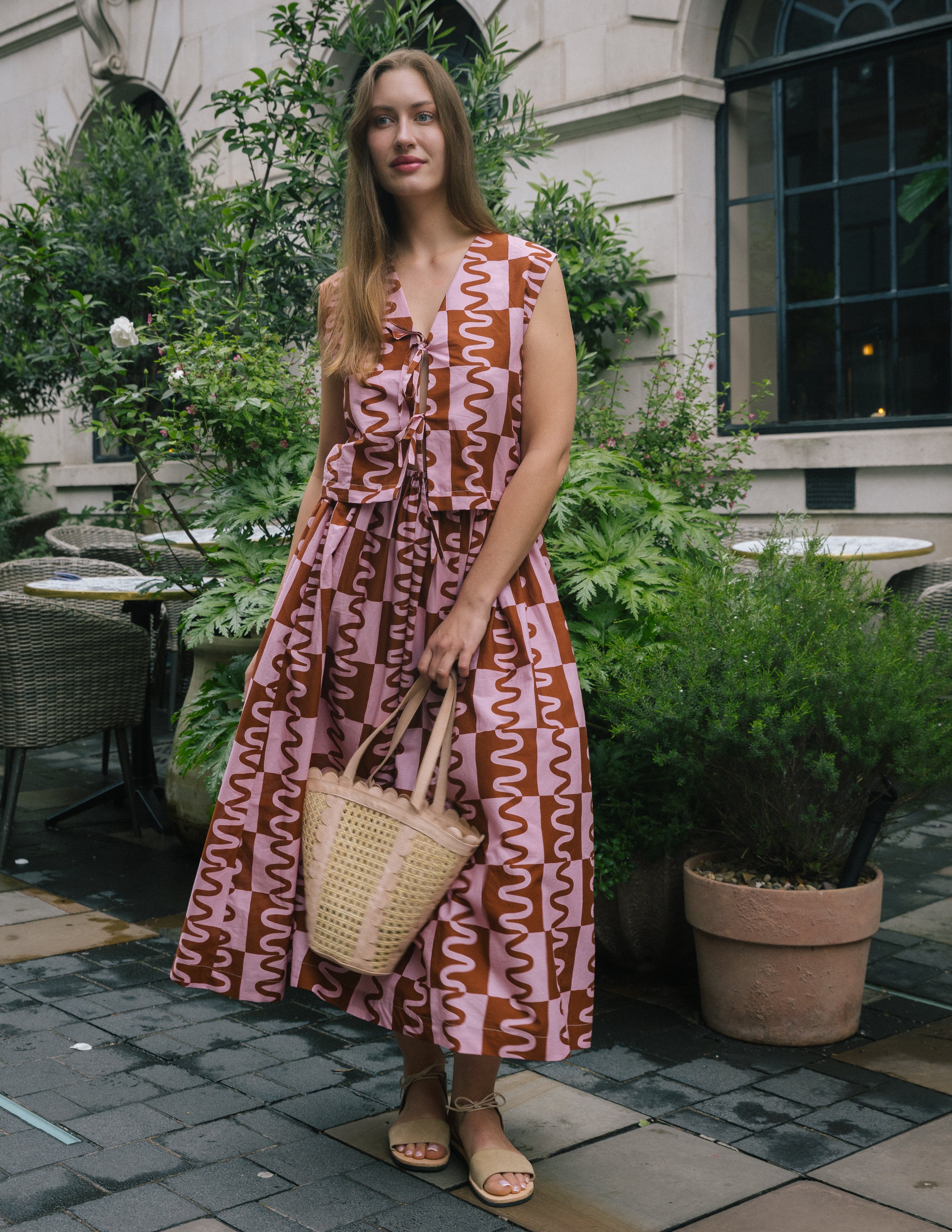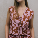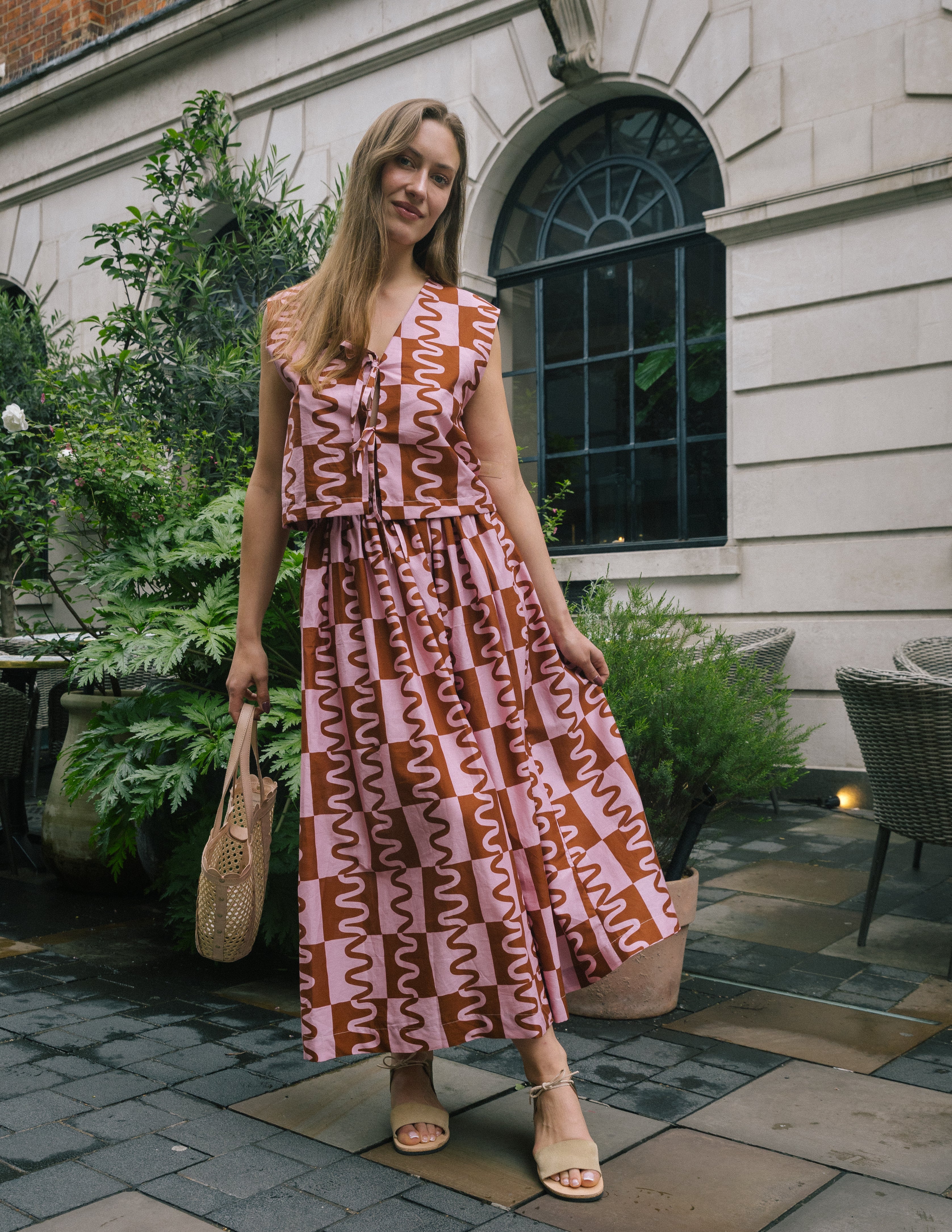 The Gracie New Wave Bow Vest is handmade in London from deadstock 100% cotton chequerboard pink and brown fabric. This versatile tie front top makes a great layering piece or can be worn on its own as a beautiful high summer top.