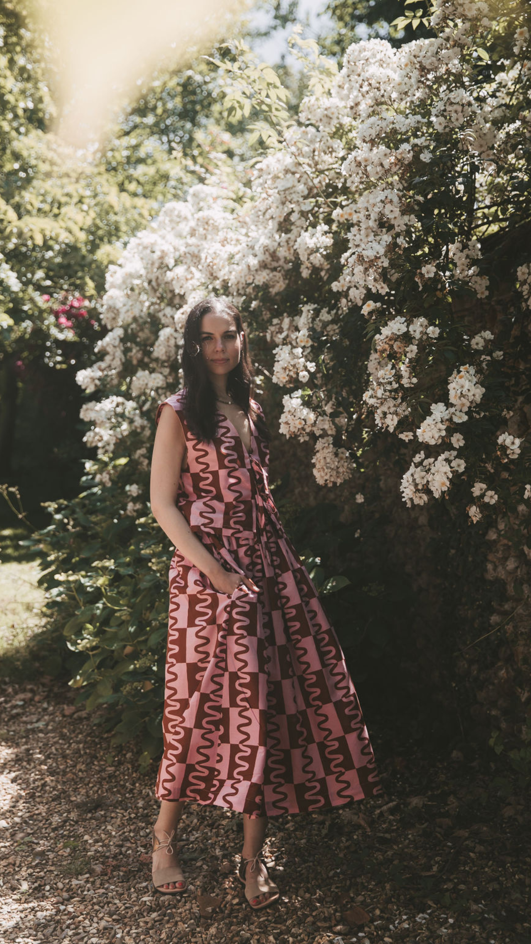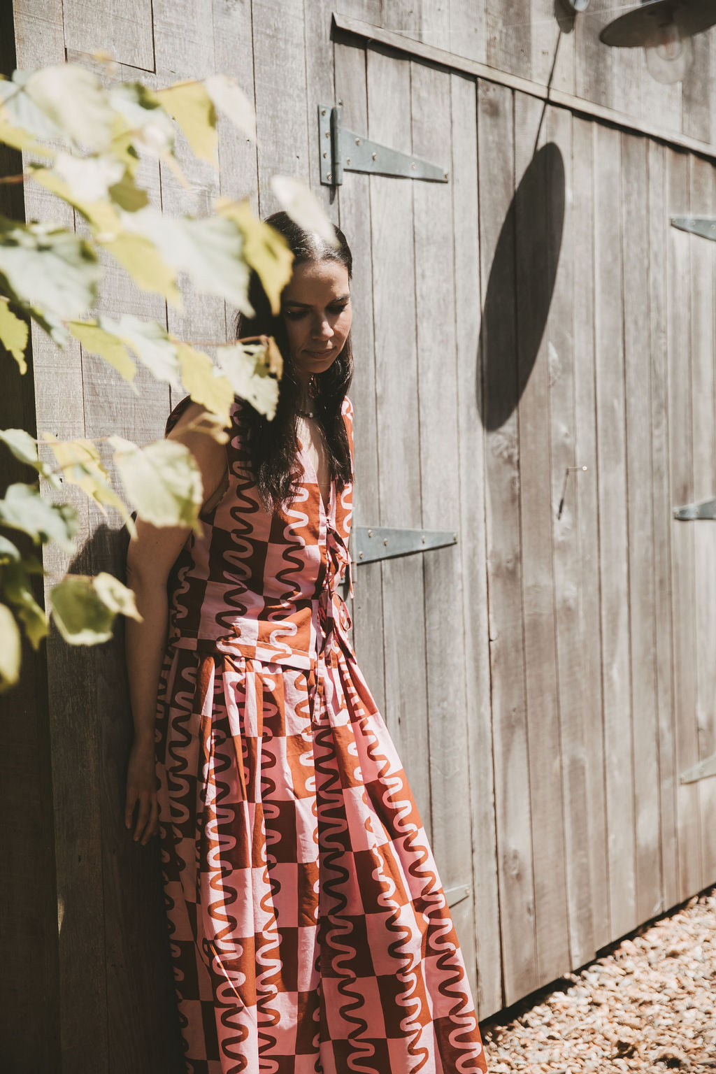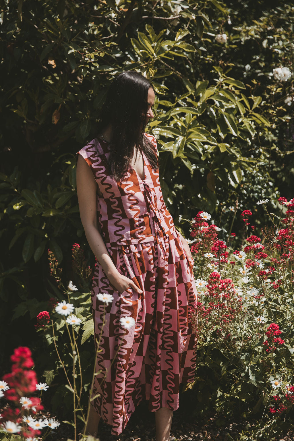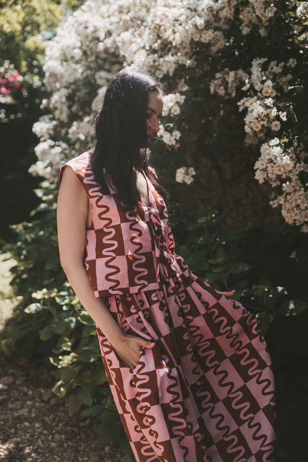 The Gracie New Wave Bow Vest is handmade in London from deadstock 100% cotton chequerboard pink and brown fabric. This versatile tie front top makes a great layering piece or can be worn on its own as a beautiful high summer top.