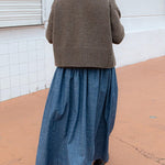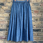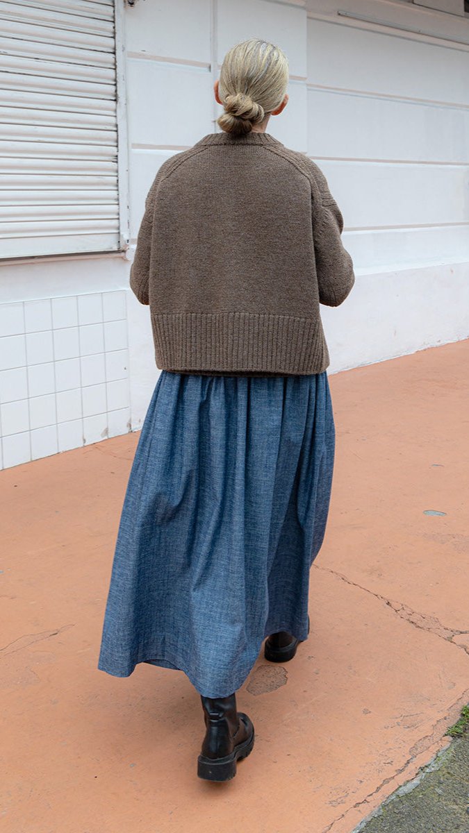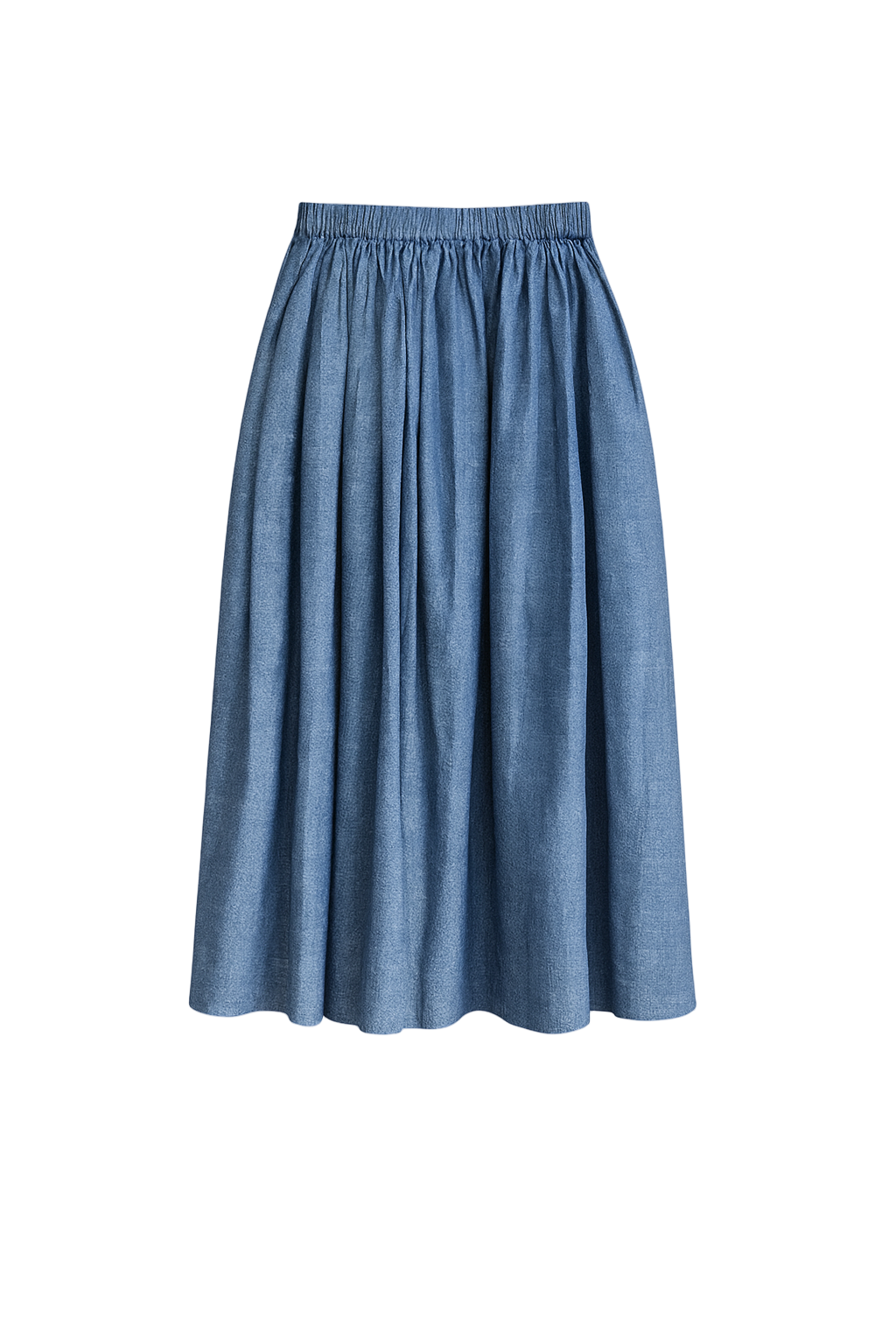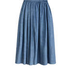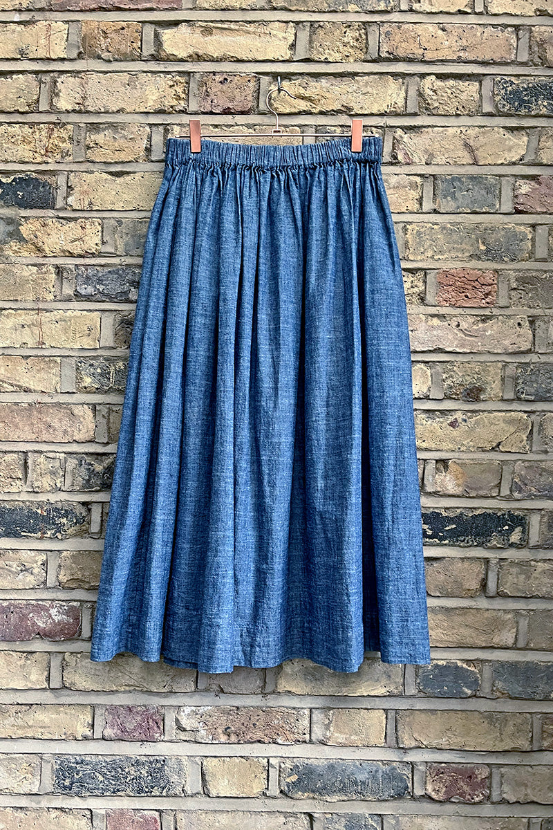 The Denim Chambray Tina Skirt by Elwin is a cotton midi skirt, handmade in London from mid-wash chambray. With its soft drape, gathered shape and chunky elasticated waist, it brings ease and modernity to everyday dressing.