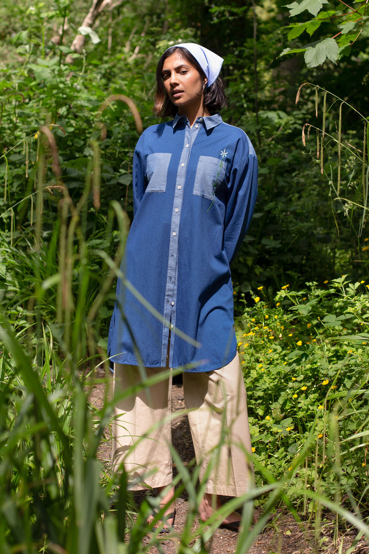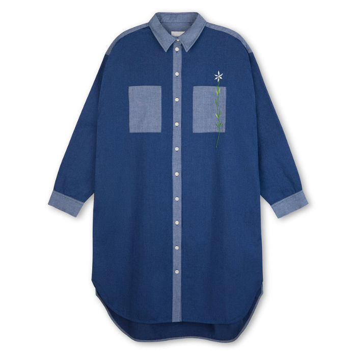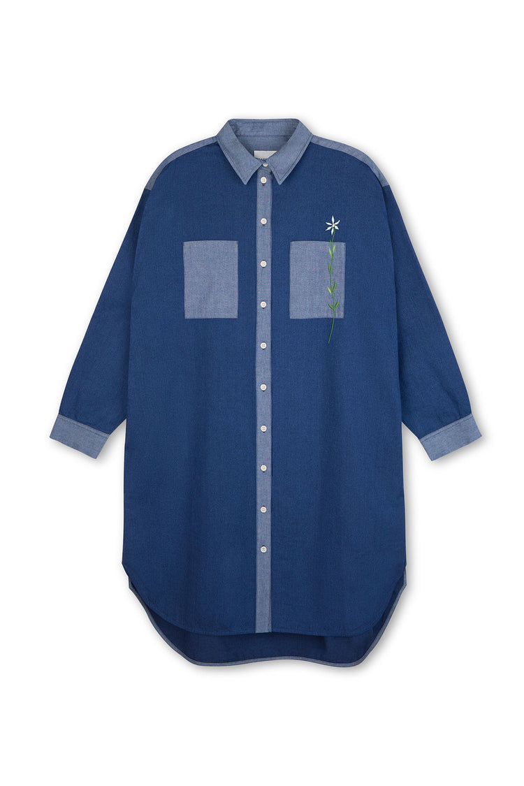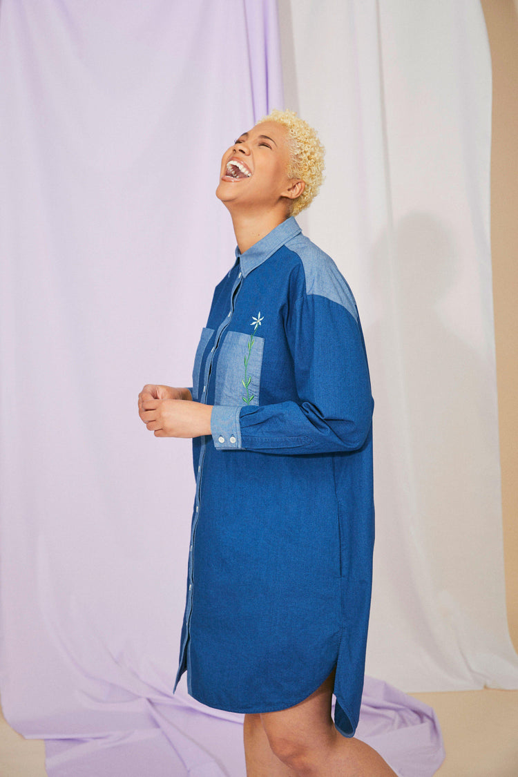 The Etta Oversized Shirtdress in Japanese Denim Cotton by Saywood is a story of contrasts. Cut from premium Japanese denim cotton for an oversized fit and sitting just above the knee, it subtly plays on colour and texture with panels of natural indigo and paler blue, while the utility feel is balanced with feminine floral embroidery. Natural cream corozo buttons lend a special touch to this versatile piece, which can be worn across seasons and in multiple ways.