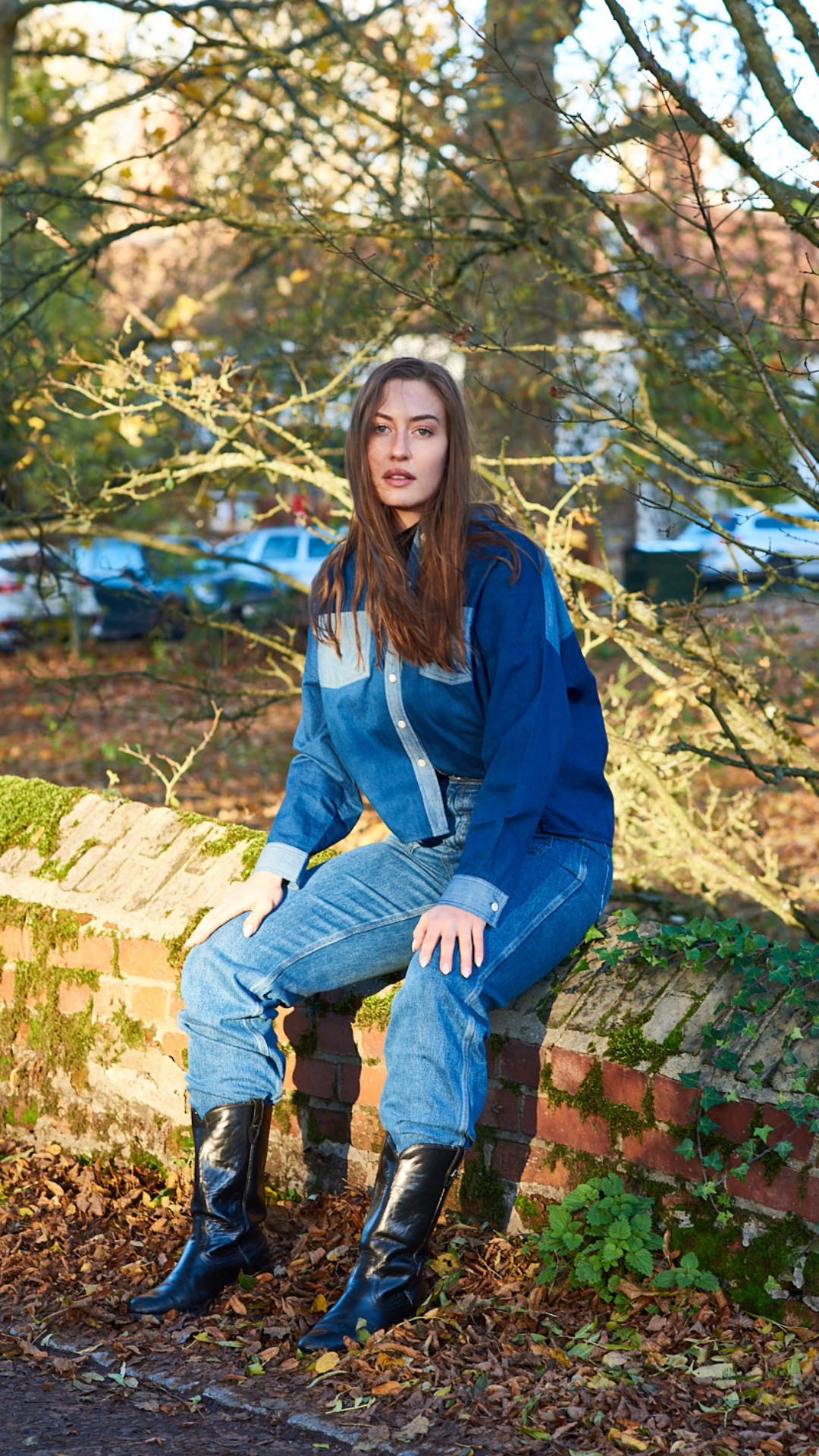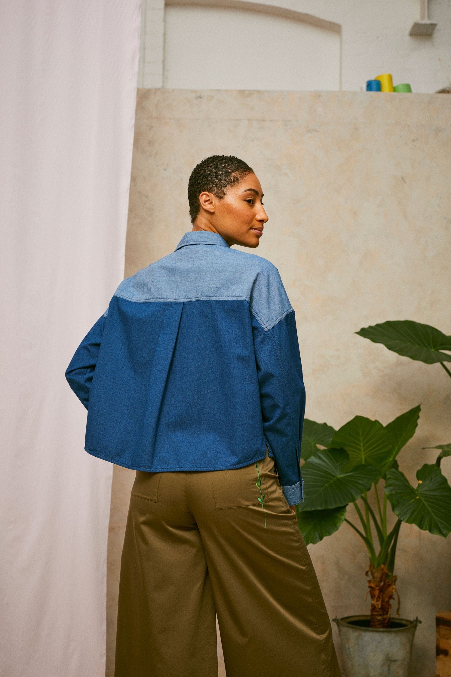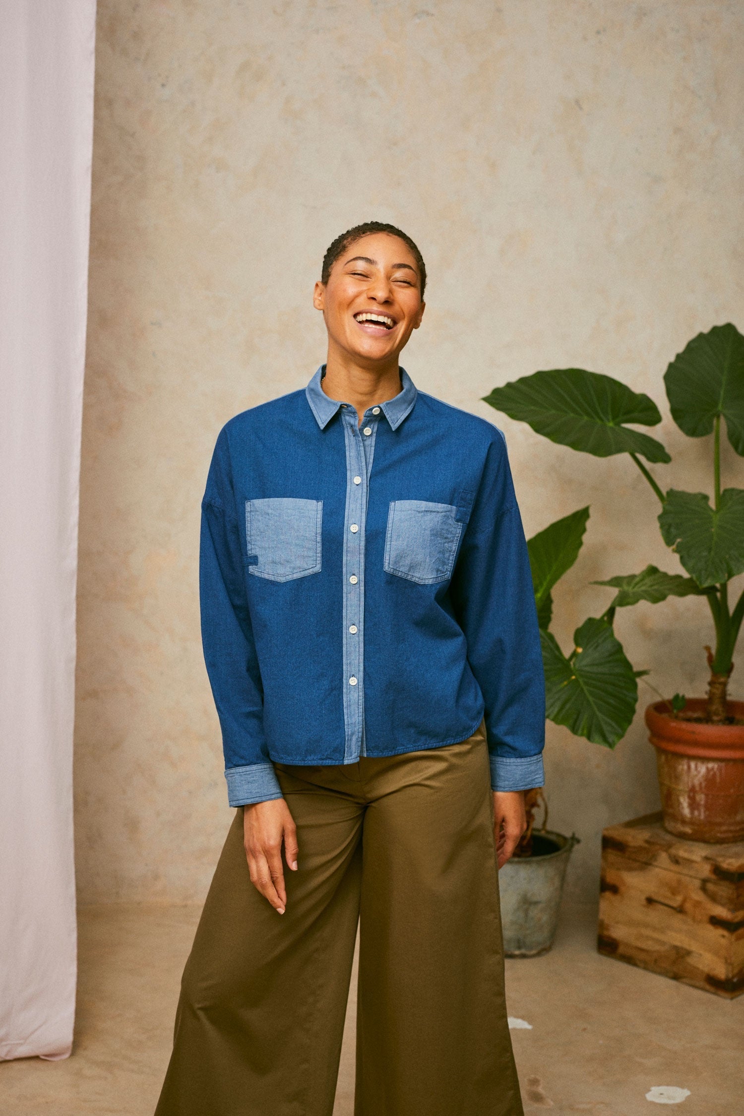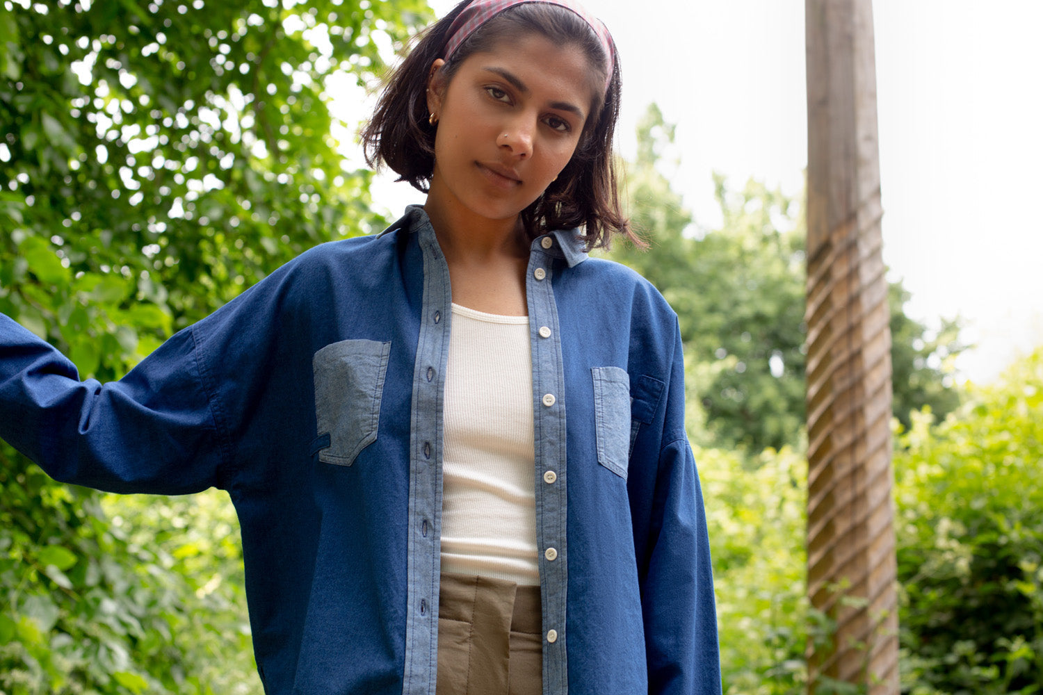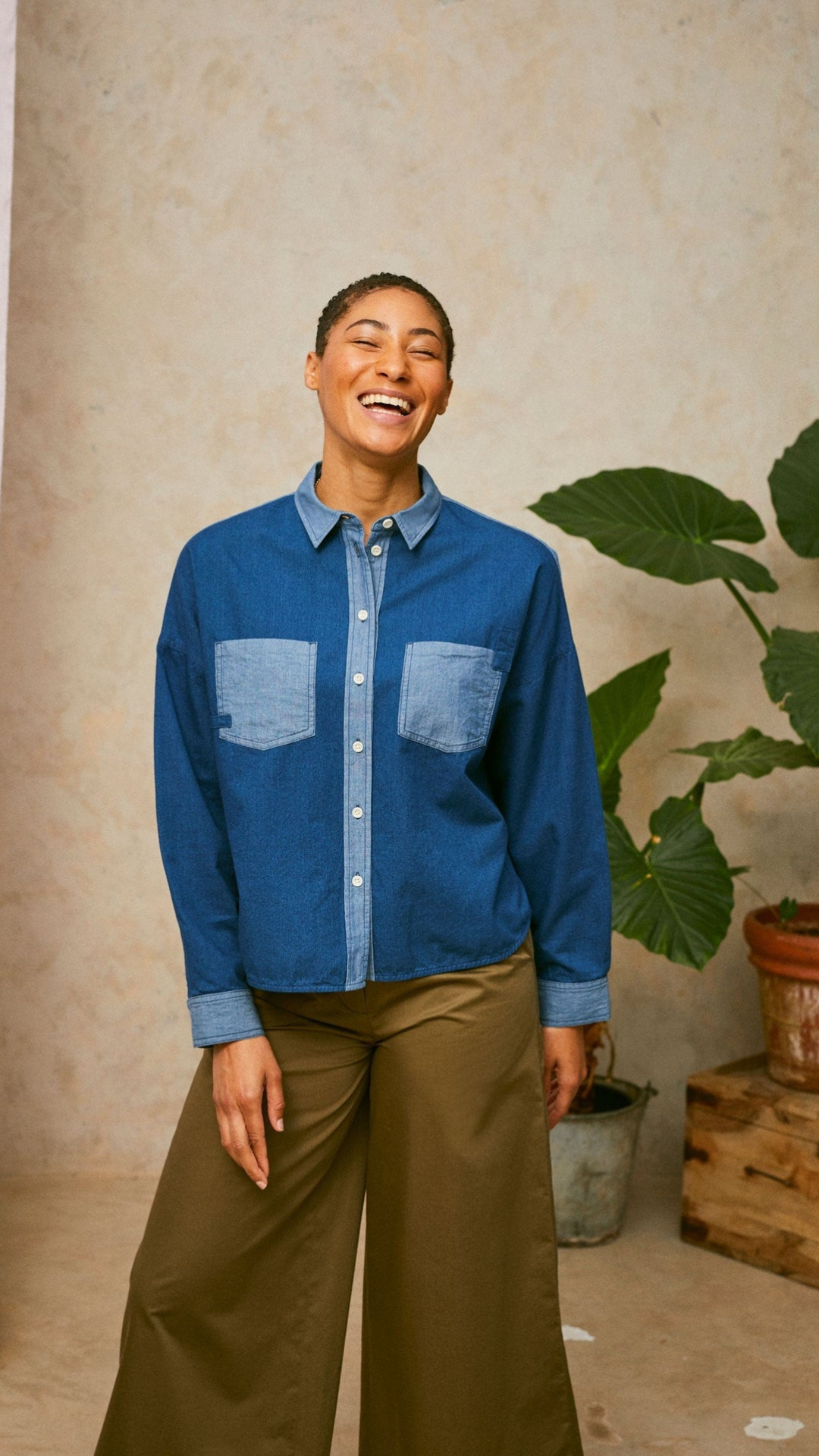 A contemporary reimagining of classic denim styles, our Lela shirt plays on contrasts, coming in sleek indigo, with details picked out in richly textured pale-blue warp denim. Woven from premium Japanese cotton, it’s cut for an oversized fit, with a boxy silhouette, dropped shoulders, and mini side splits. Special flourishes complete this timeless wardrobe foundation: tonal topstitching, natural ivory corozo buttons, box pleating and contrast yoke at the back, and curved hem, which means the shirt hangs beautifully when worn untucked. Look out also for our Lela shirt in sunny pastel orange and yellow cotton.