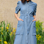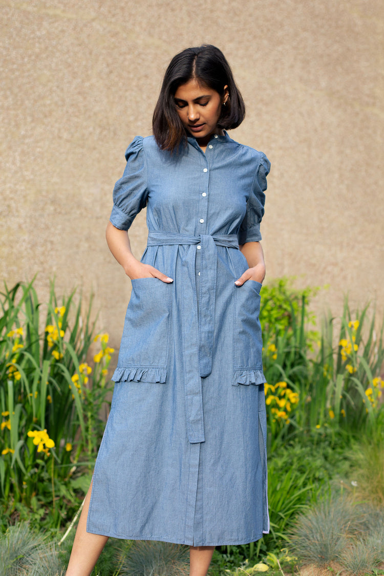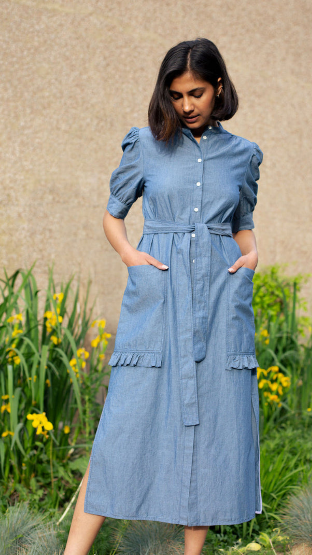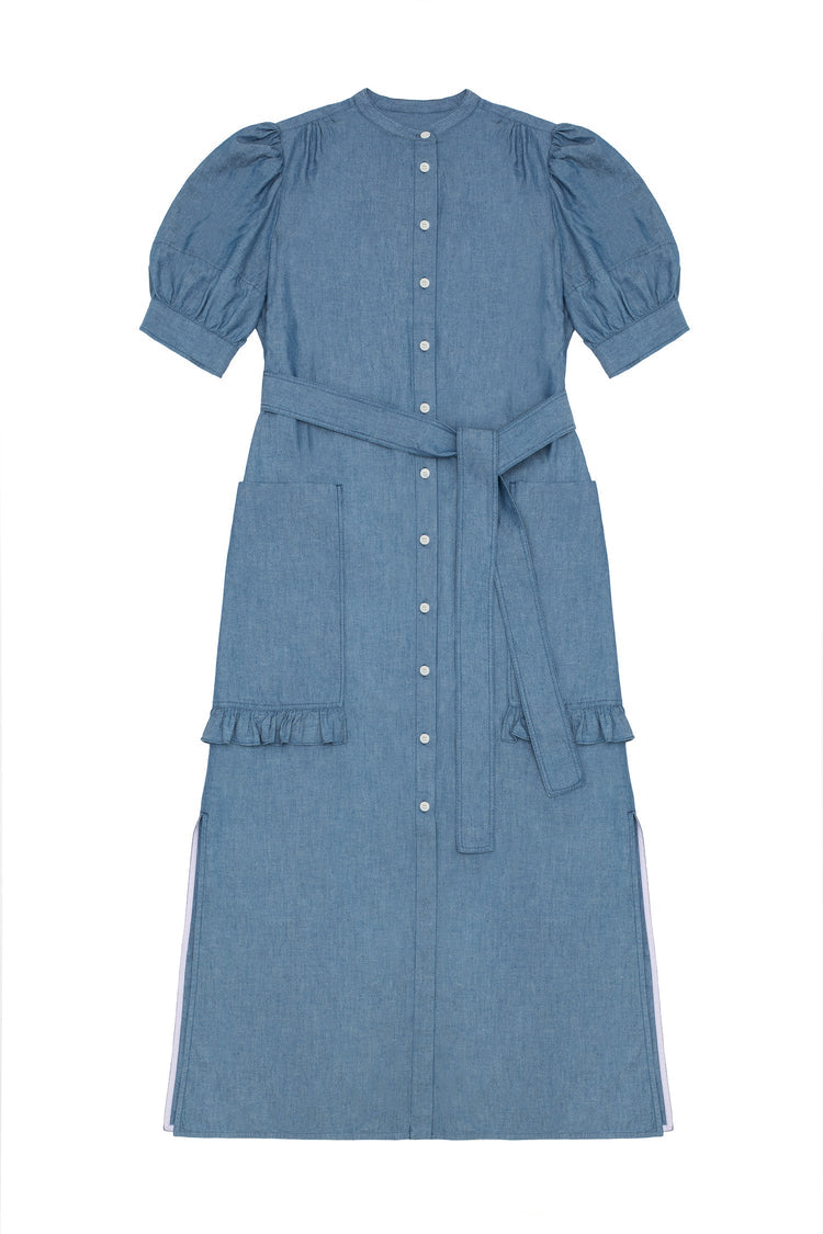 The Rosa Puff Sleeve Shirtdress in Blue Light Wash Japanese Denim by Saywood is a keeper. Made from a beautifully textured Japanese cotton – woven by artisans using time-honoured techniques in Ibara, Japan – it gets even better with age. The structural form is contrasted with easy volume, while the utilitarian feel of denim is offset with playful details – the puffed sleeves, the patch pockets trimmed with ruffles, the side splits on the skirt. Finished with dark-blue topstitching, adjustable corozo button cuffs on the sleeves, and neat bound hems in contrasting lilac, it' a true forever piece.