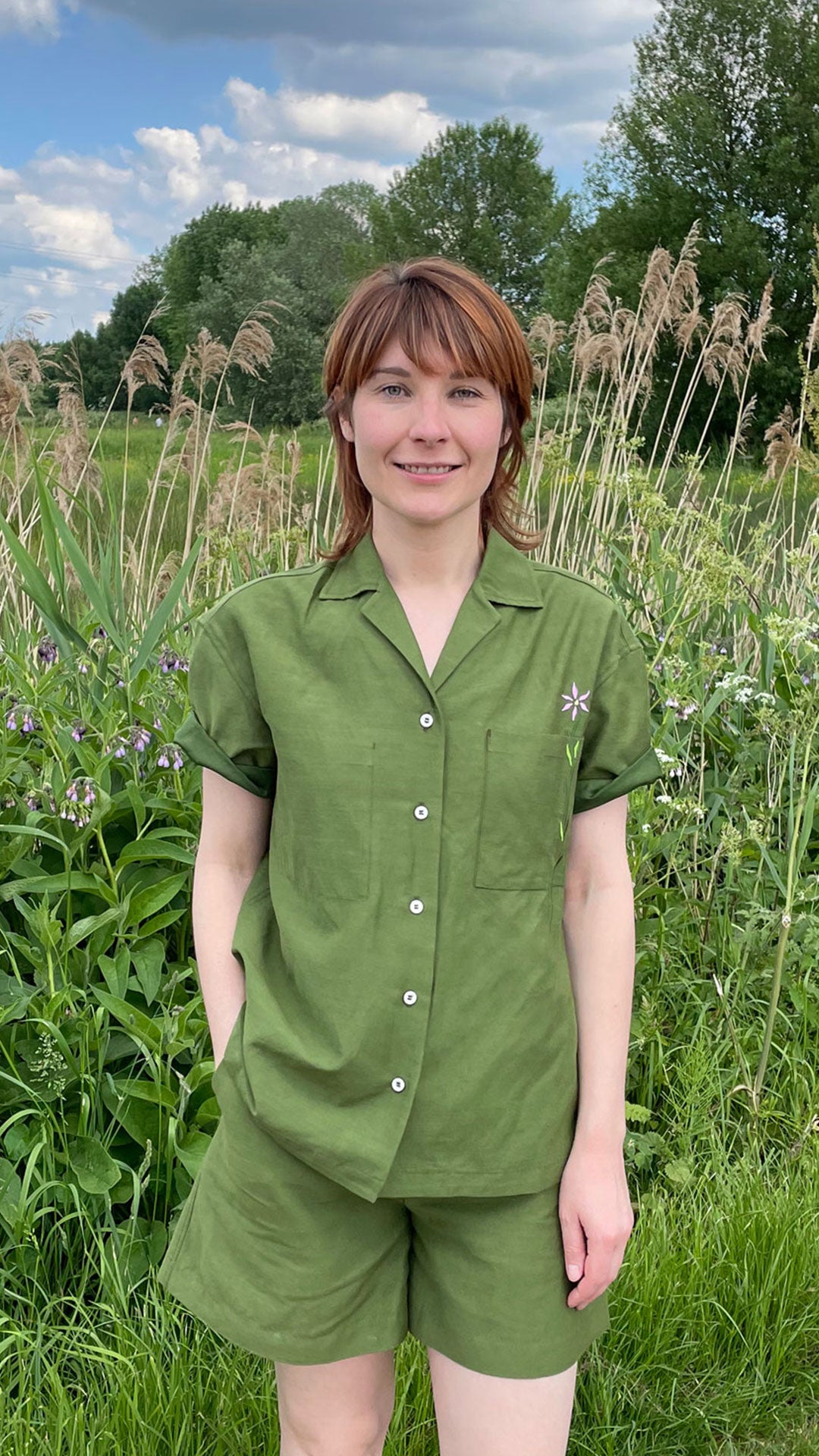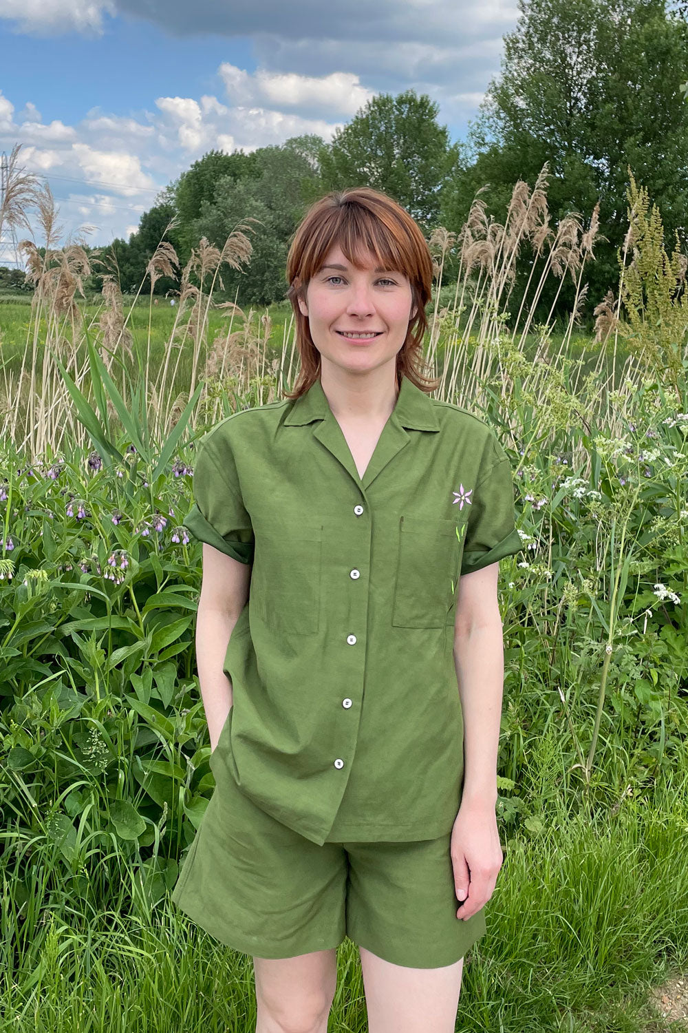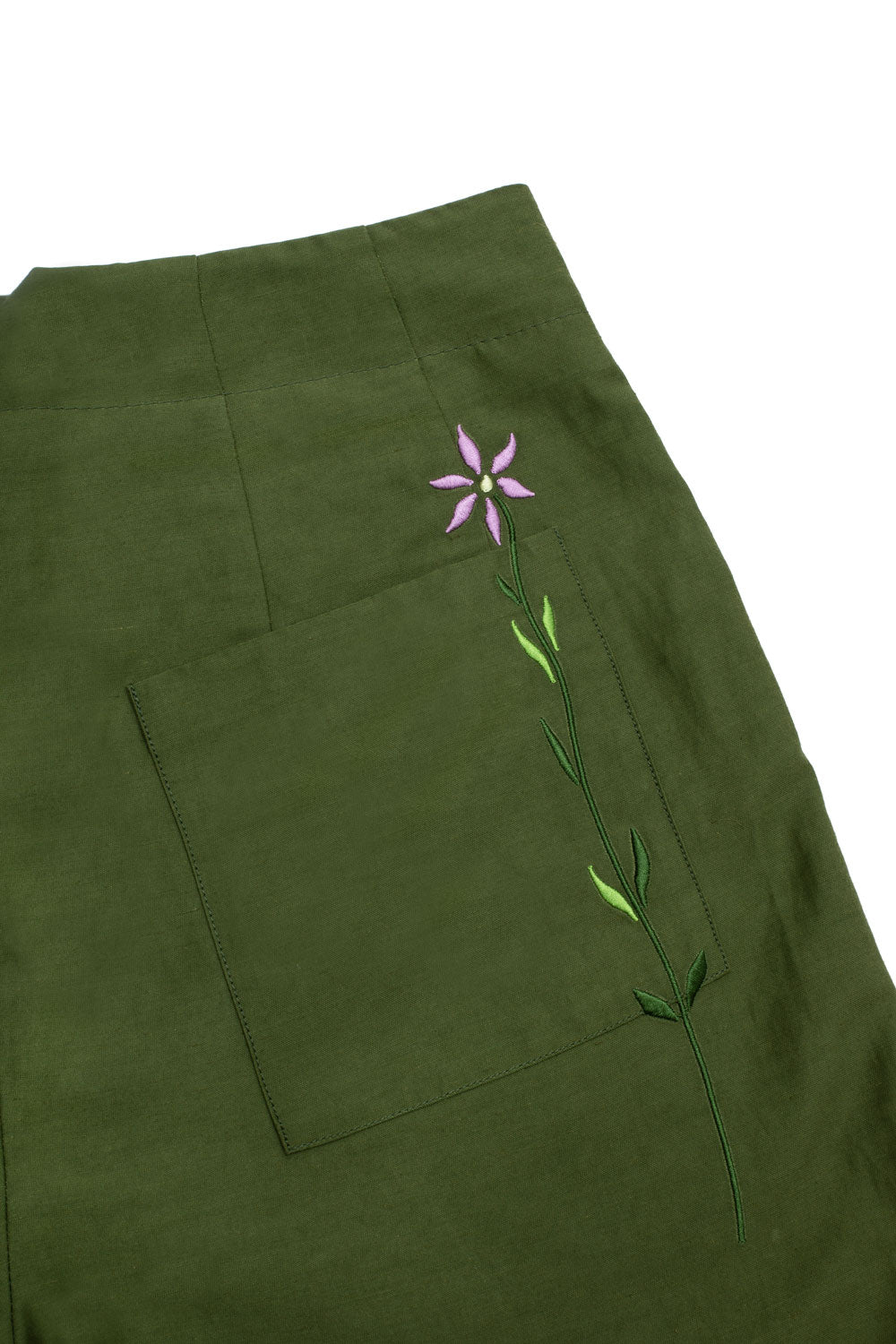 Finished with a discreet corozo button and zip-fly fastening, back patch pockets, topstitching and Saywood’s trademark embroidered flower, the Bessie Short is the perfect summer in the city and those beautiful holiday getaways.