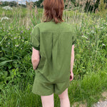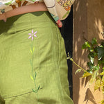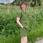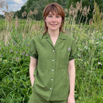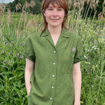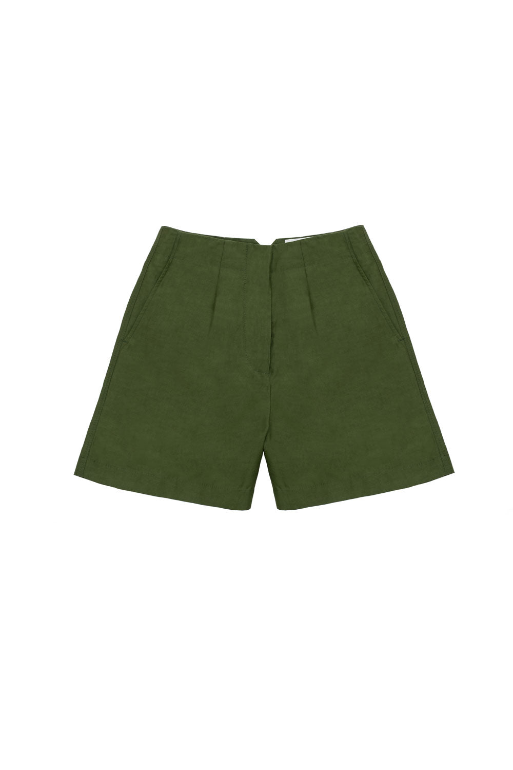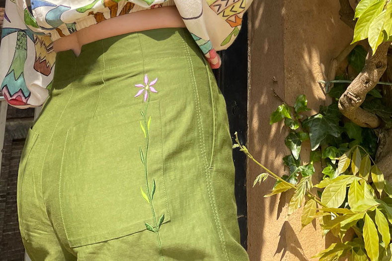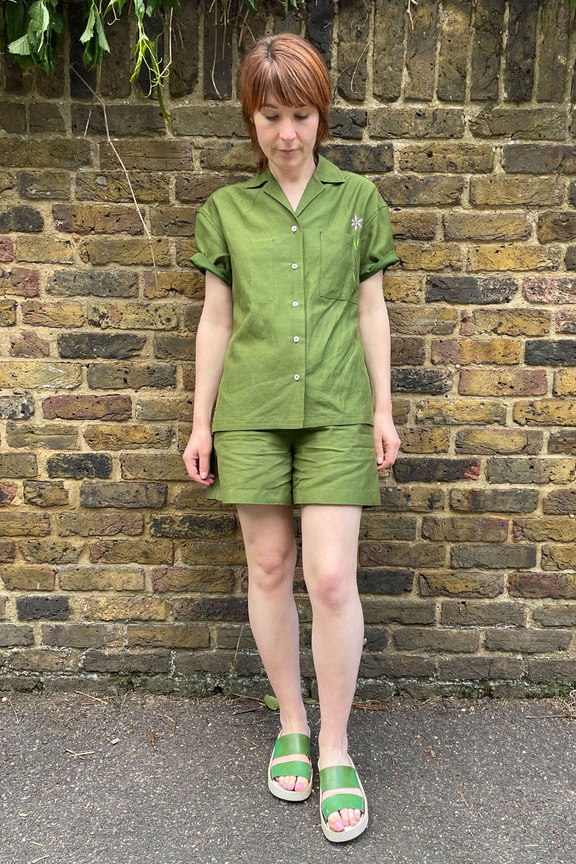 Hand cut from a fluid softly slubby green cloth in a luxe viscose, linen and cotton blend, repurposed from designer deadstock.