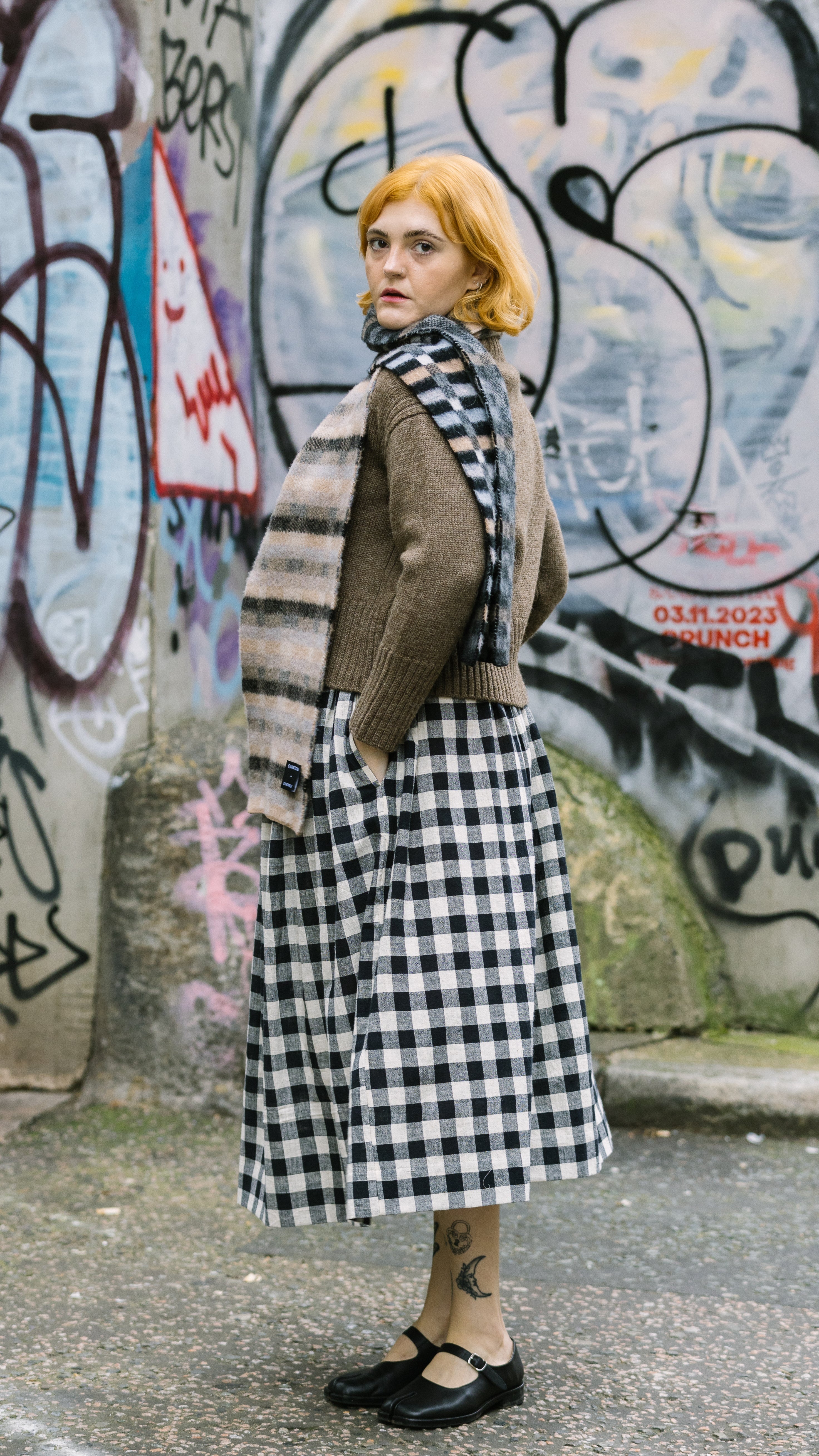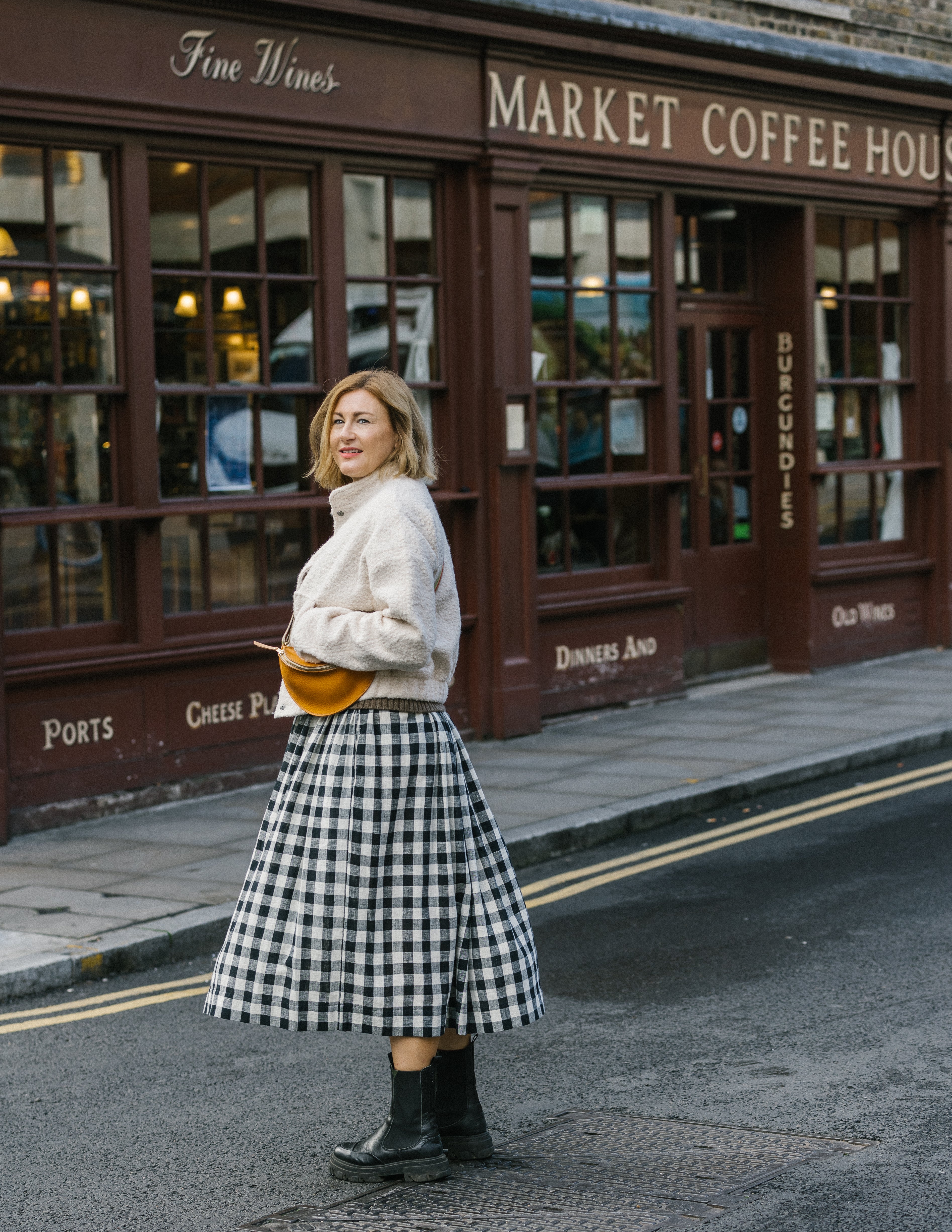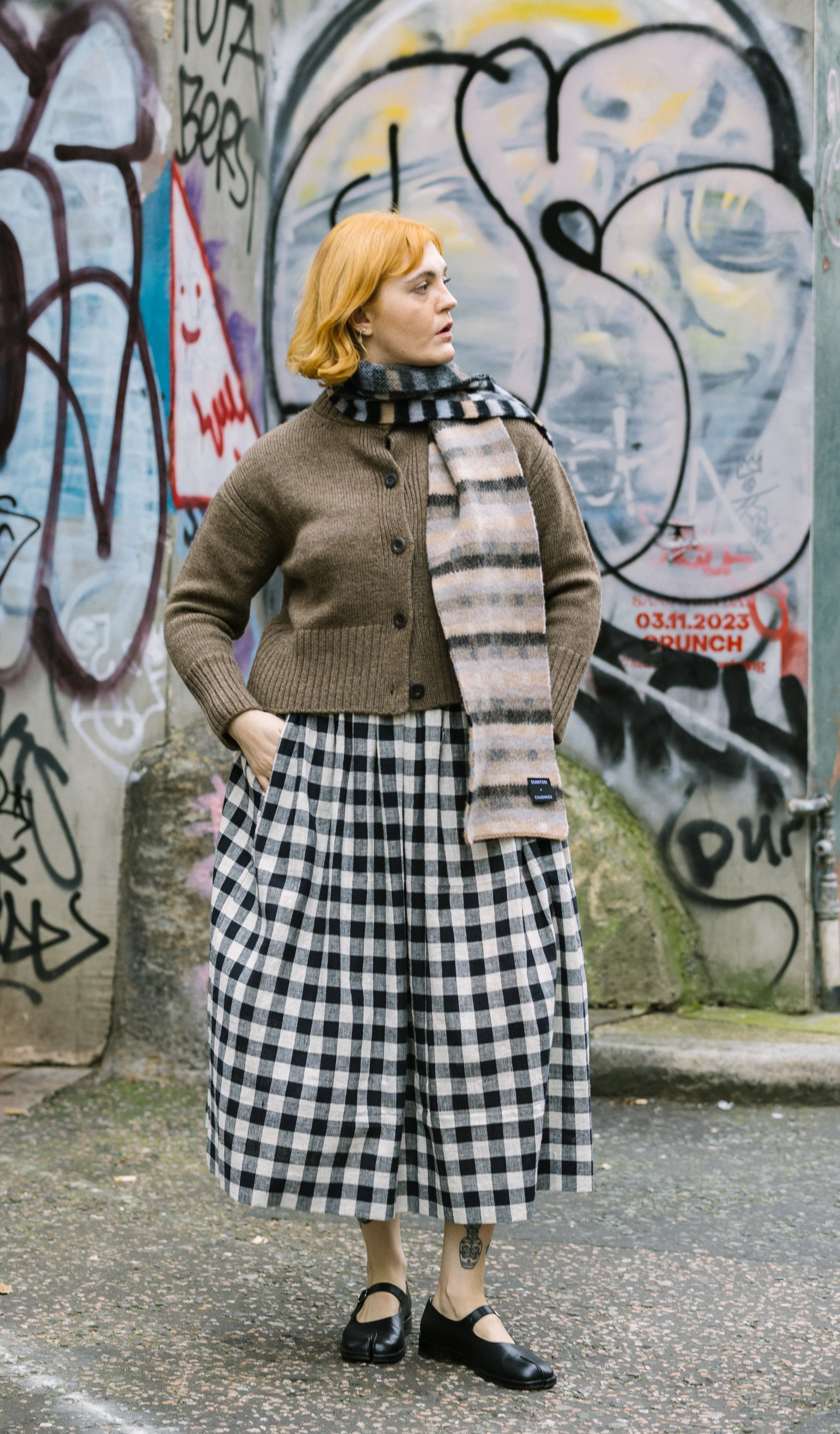 The Tina Skirt in Black and White Gingham is a contemporary take on a timeless style. Made in the UK from handloomed organic kala cotton, this full gathered skirt offers ease, movement, and sustainable craftsmanship.